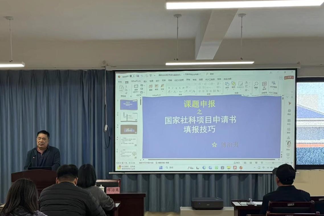 11月14日,外贸与外语学院特邀桂林旅游学院傅治夷教授在文汇楼702会议室举办国家社科基金项目申报专题指导讲座,全院教职工积极参与。