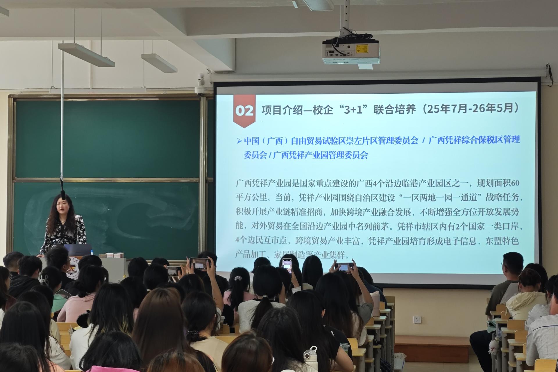 接着,农方老师介绍了校企联合开展的“3+1”培养项目。在“3+1”联合培养项目中,学生将进入更具政策支持背景的单位,如广西凭祥综合保税区管理委员会等国家级平台、凭祥市国际贸易开发集团有限公司等,业务涵盖报关、物流、仓储与国际市场拓展,实习岗位主要涉及报关员、仓储管理、外贸业务助理等。该项目可置换课程学分,表现优秀者优先留企就业。实习期间,企业导师与校内指导教师将共同负责管理,实习生还将享有食宿、津贴、班车等基本保障。在互动答疑环节,在场教师针对同学们关注的岗位设置、选拔标准及职业发展等问题进行了详尽解答。