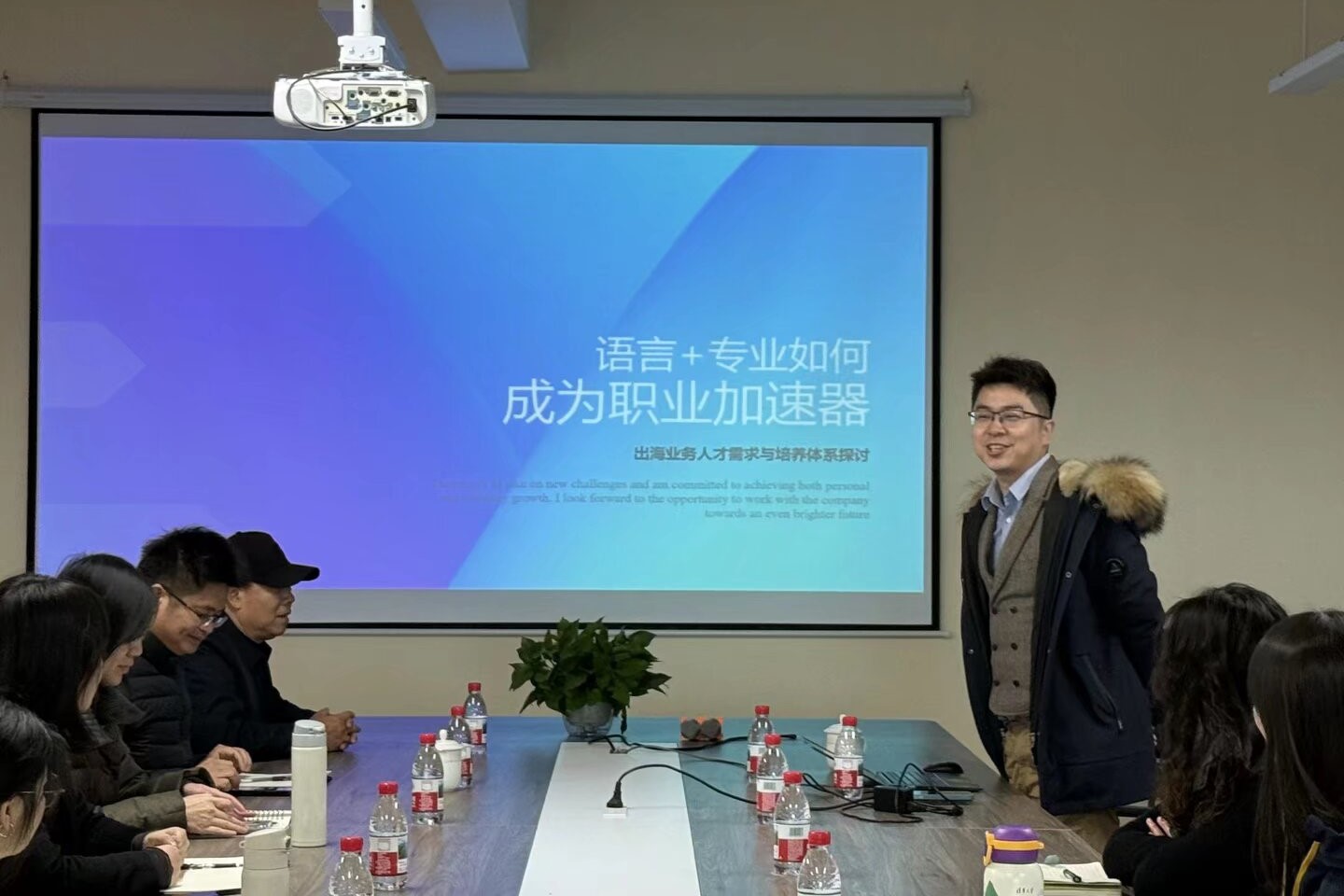 院长王家年介绍学院英语(含商务英语)、国际经济与贸易等专业设置及就业情况,强调专业与企业海外人才需求的适配性;教研室主任结合课程体系,探讨人才培养与市场需求的契合点,交流优化课程、增设实践项目的思路;党委副书记杨锦超就学生就业指导相关工作,与企业交流经验。