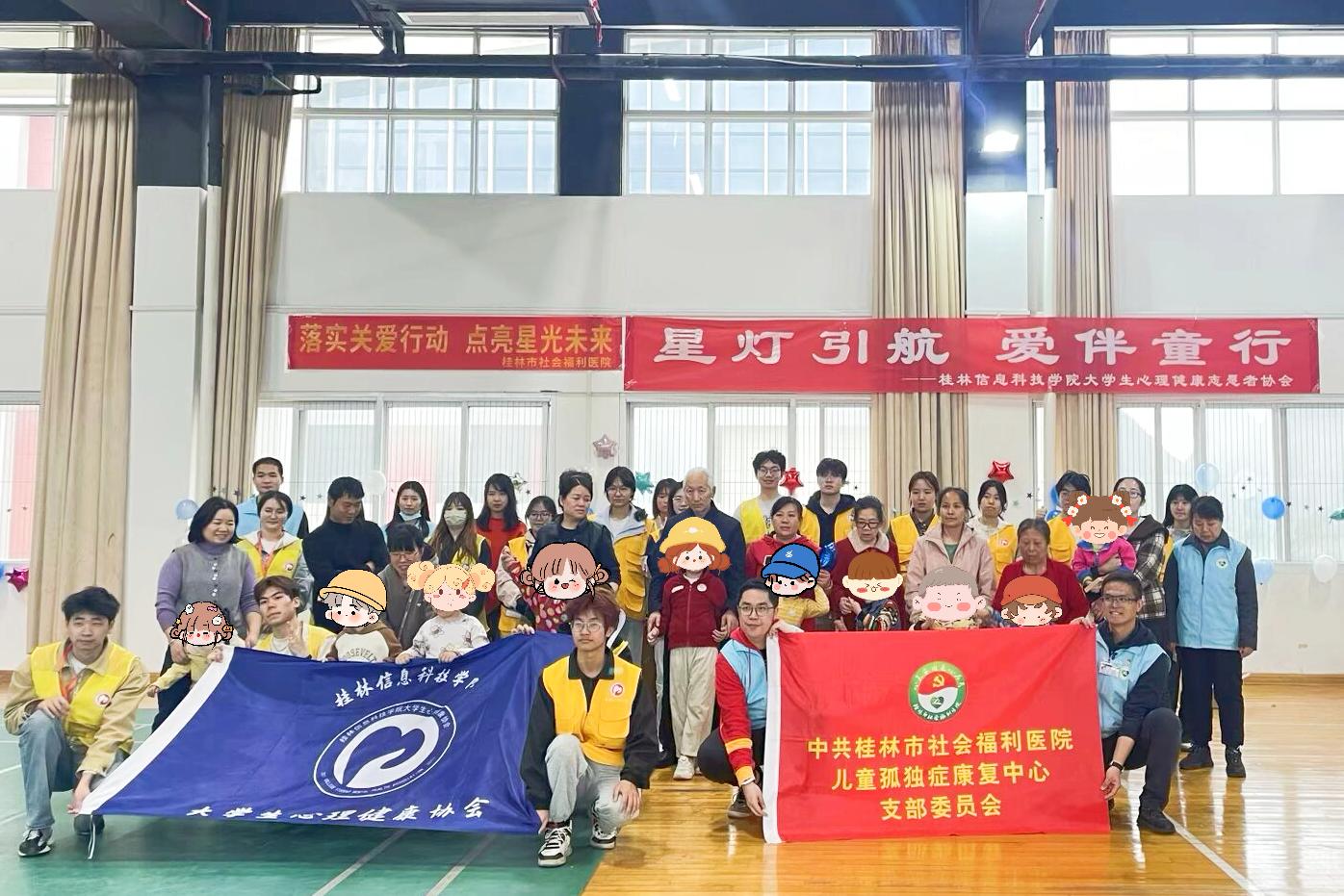 在4月2日世界自闭症日即将来临之际,pp电子模拟器网站大学生心理健康志愿者协会携手桂林市社会福利医院于3月28日在桂林市社会福利医院体育馆,共同举办了一场以“星灯引航,爱伴同行”为主题的社会实践活动。此次活动旨在给予自闭症儿童及其家庭支持与温暖,让他们感受到社会的关怀与善意,更希望借此呼吁社会各界,给予自闭症群体更多关注的目光,为这些星宝们点亮前行的希望之光,共同营造一个充满包容与接纳的社会环境。