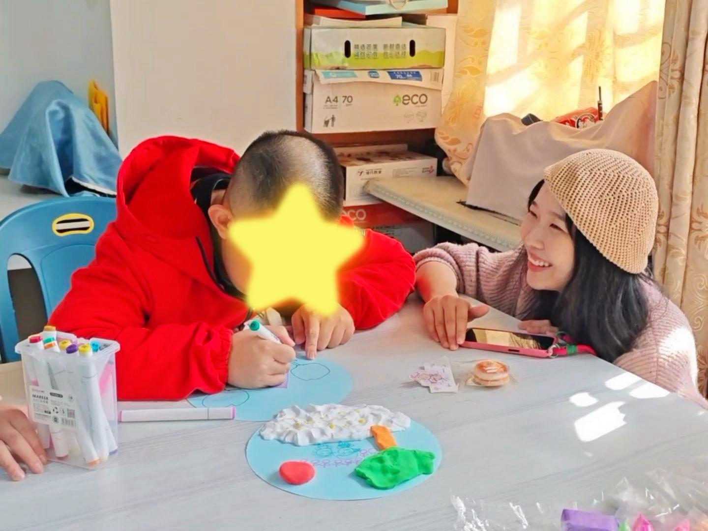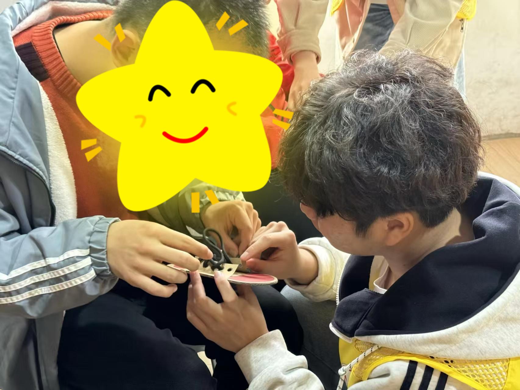 活动当天,志愿者们迅速分工,用雪花片、气球、主题挂布等精心布置场地,营造出温馨欢快的氛围。在熟悉“心” 朋友们的喜好与需求后,活动于上午 9 点 40 分正式拉开帷幕。活动精心设计了四大实践环节。“系鞋带”游戏中,“心”朋友们手持鞋子卡片和鞋带,在志愿者一对一或小组引导下尝试穿绳、打结,在解锁基础技能的过程中积累自信与勇气;“模拟购物”环节里,大家化身小顾客,手持练功券与志愿者扮演的店员互动,完整体验问价、付款、找零流程,在趣味交易中提升社会适应力与沟通力;“模拟过马路”游戏中,志愿者通过红绿灯演示装置模拟真实交通场景,引导“心”朋友们识别信号、判断通行,筑牢独立出行的安全防线;“冬日风景画”创作环节,圆卡纸、马克笔、粘土与纸巾巧妙结合,大家尽情发挥创意,在动手创作中舒缓身心、收获满满成就感。每个环节都有志愿者全程耐心陪伴与指导,及时给予鼓励与支持,整个活动现场洋溢着温暖与欢乐的氛围。