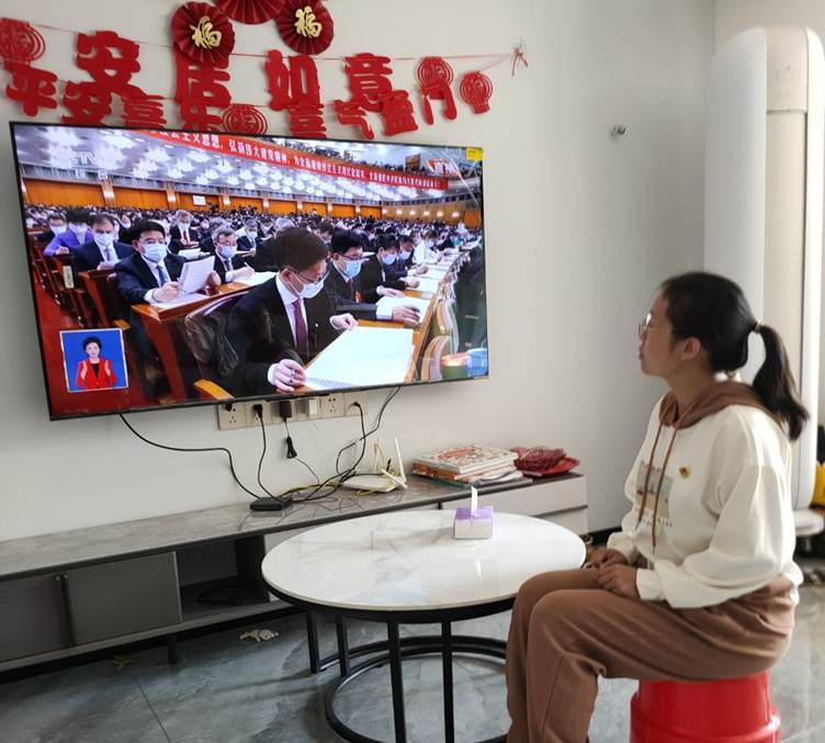 入党积极分子温小梅收看党的二十大开幕会