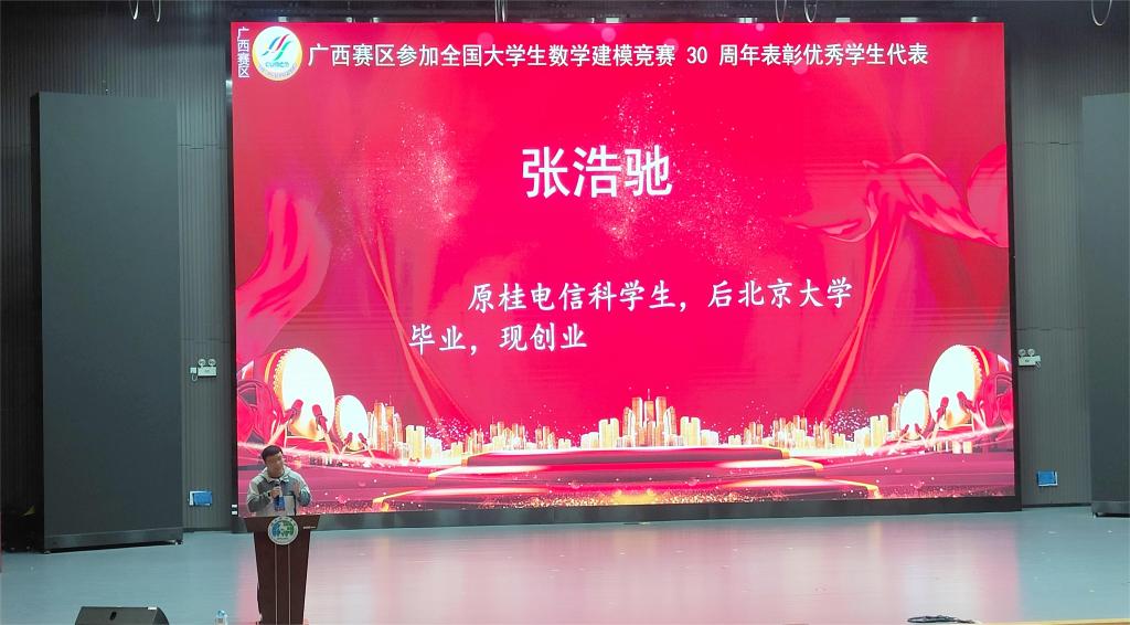 本次庆典活动不仅对23年广西赛区建模工作进行了总结,还对长期以来为数学建模科研,教学与竞赛活动作出重要贡献的教师、23年获国奖学生及其他优秀人才进行了表彰,pp电子18届毕业生张浩驰作为优秀学生代表发言。同时为庆祝广西赛区参加全国大学生数学建模竞赛30周年,现场还举行了30周年庆典联欢晚会。