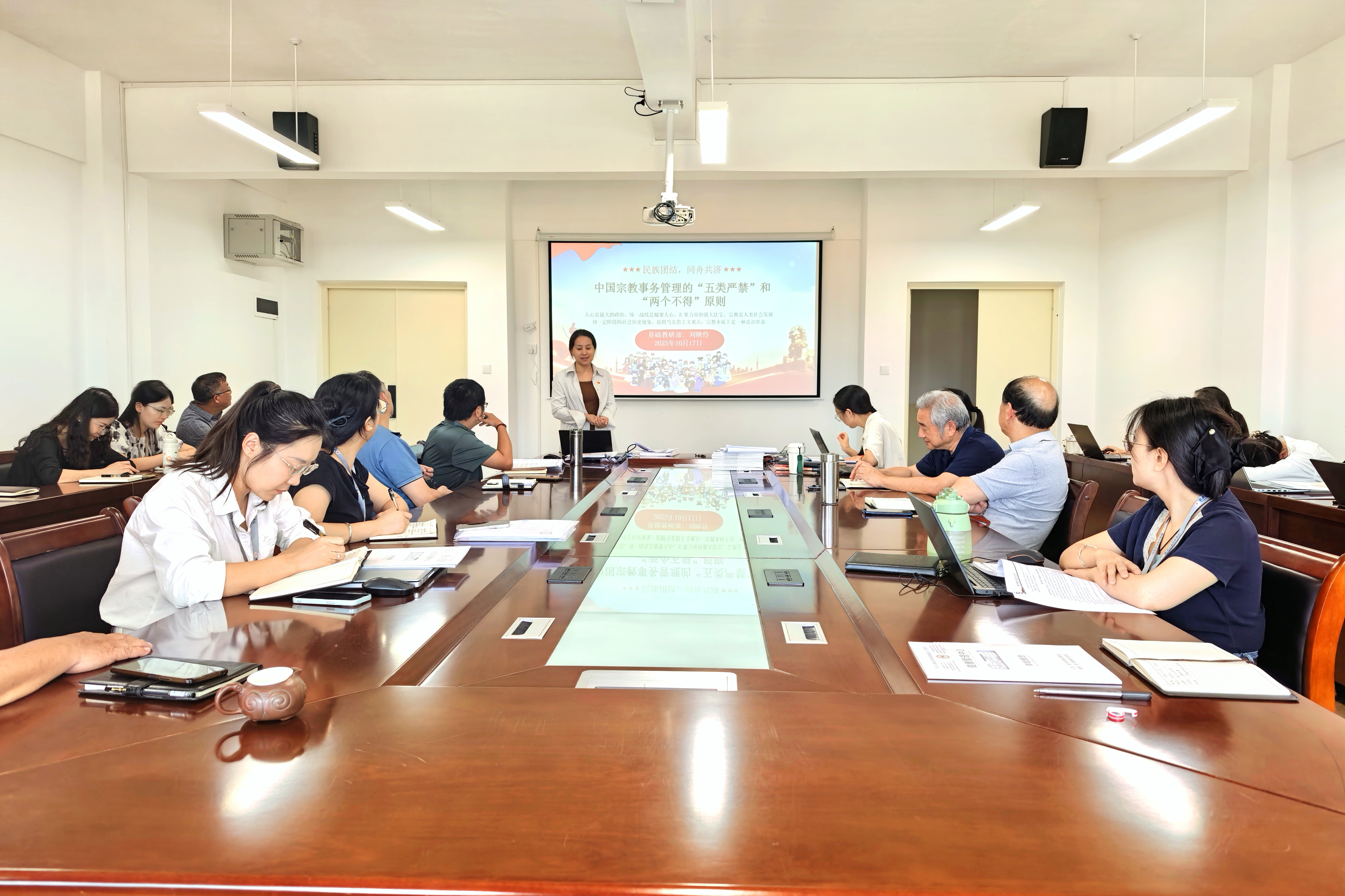 为深入学习贯彻党的民族理论政策,强化教职工对宗教事务管理法规的认知,切实维护民族团结与校园和谐稳定,10月17日,基础教研部在汇通楼H504会议室组织开展党的民族理论政策法规专题学习宣传活动。本次学习会议由基础教研部教工党支部书记刘映伶主讲,部门全体教职工积极参与,共同筑牢思想防线、提升政策理解能力。