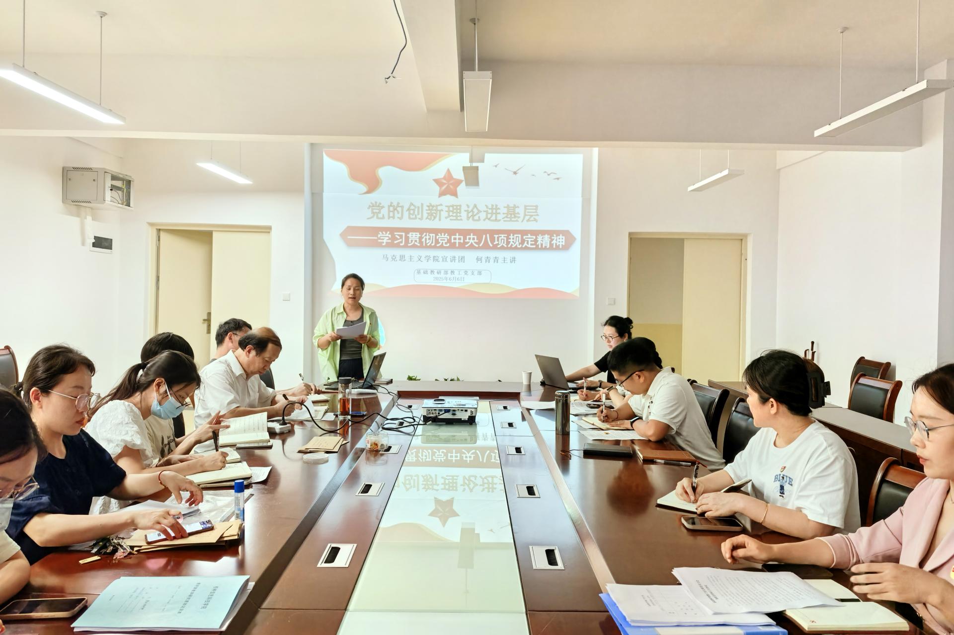 为深入学习贯彻党的二十届三中全会精神,全面落实新时代党的建设总要求,紧密结合pp电子高质量发展目标任务和党员队伍建设实际需求,6月6日,基础教研部教工党支部在汇通楼H504会议室成功开展2025年党的创新理论进基层宣讲活动。此次活动由教工党支部书记刘映伶主持,马克思主义学院何青青老师担任主讲,基础教研部教工党支部全体党员积极参会。