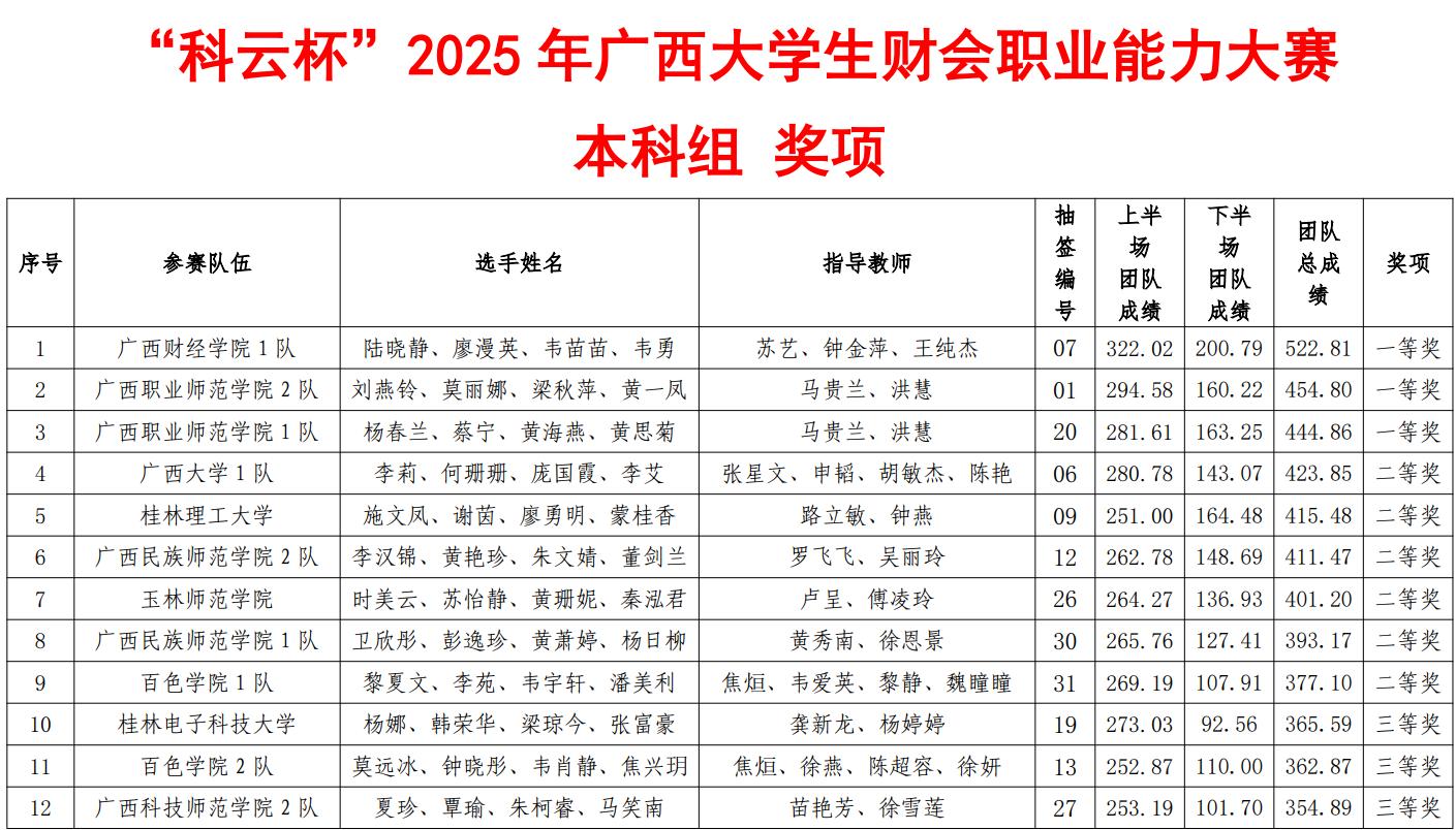 近日,由广西壮族自治区教育厅指导、中国商业会计学会主办的2025年"科云杯"广西大学生财会职业能力大赛圆满落幕。pp电子模拟器网站商学院选派的两支参赛队伍,凭借扎实的专业基础、出色的团队协作和稳定的现场发挥,从全区各高校参赛队伍中脱颖而出。均荣获本科组三等奖。两支队伍指导教师薛琳、刘凤英、唐杭琪同时获评"优秀指导教师"称号。