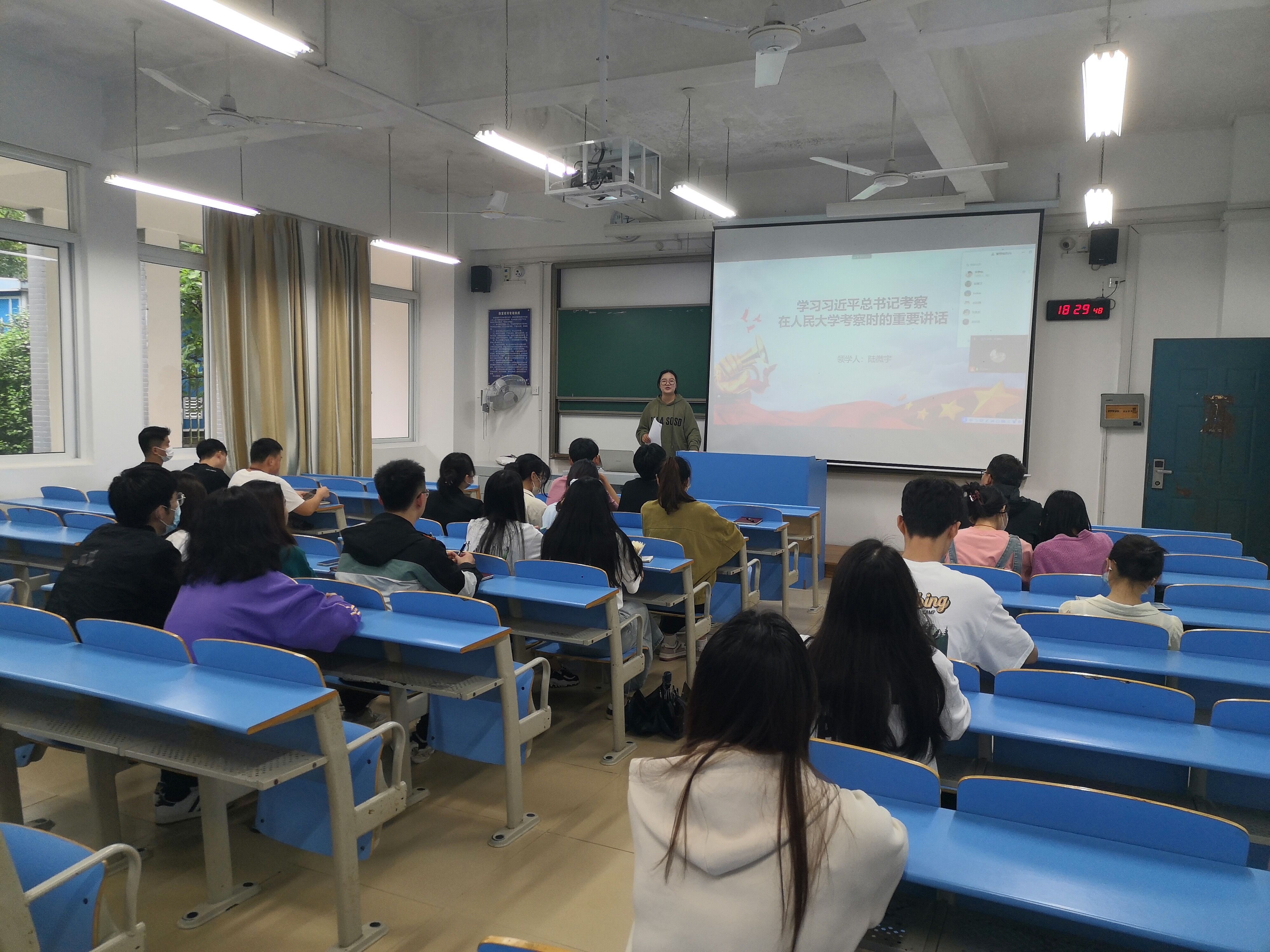 5月6日,由商学院党总支主办,第一学生党支部承办的深入学习习近平总书记在中国人民大学考察时的重要讲话精神,第一学生党支部书记李静怡领学,全体党员线上参加会议。