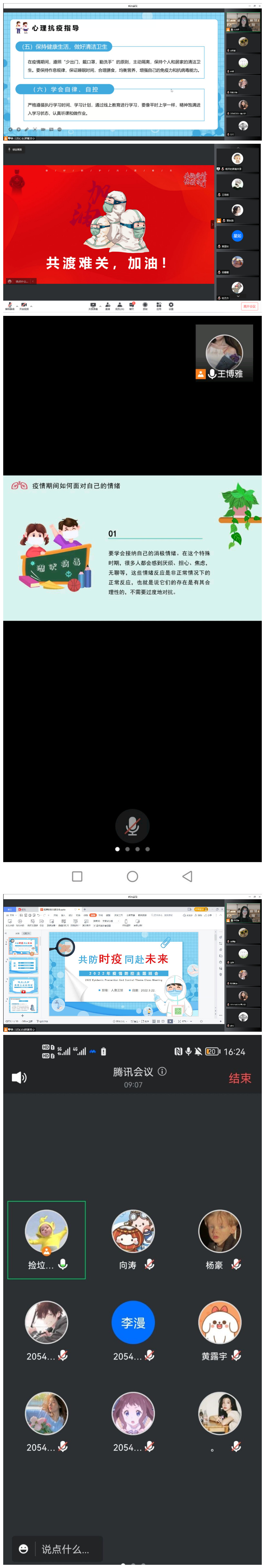 为进一步落实学校关于新冠肺炎疫情防控工作要求,提高全体学生的疫情防控意识,帮助学生掌握防疫知识,有序生活学习,缓解心理压力,科学健康生活。3月15日至3月25日,我院各年级以班级为单位召开以“共防时疫,同赴未来”为主题的线上班会。
