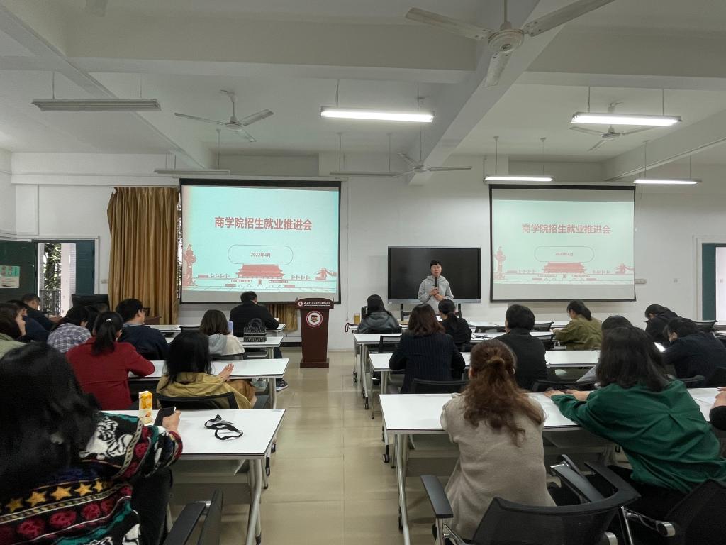 首先,由严院长传达学校招生工作会议精神和相关政策,介绍了商学院对接院校,鼓励各教研室老师积极为接下来的招生宣传工作做好前期准备。其次,赵书记分析了商学院2022届各专业毕业生目前的就业情况,对当前严峻的就业形势进行了分析,并提出三点工作要求:一是鼓励有能力的学生参加“三支一扶”、“西部计划”、“参军入伍”等招募工作,并就相关的帮扶政策进行了说明;二是对慢就业、缓就业的毕业生进行精准帮扶,为其推荐岗位、提供就业技能指导;三是动态统计未就业毕业生情况,及时更新毕业生就业信息库。最后,严院长强调,所有老师要提高思想认识和政治站位,全员参与到招生与就业工作中,承担相应的招生宣传与就业帮扶任务,共同做好商学院的人才培养与就业服务工作。