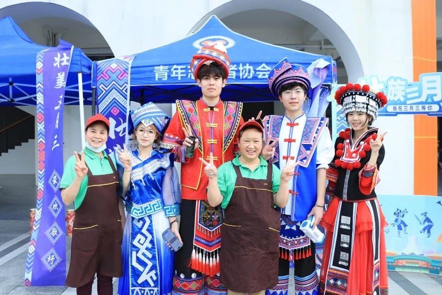 为铸牢中华民族共同体意识,庆祝广西壮族自治区传统节日“三月三”,3月27日,商学院在学校紫荆广场举办“桂林山水颂 情系三月三”民族文化活动。