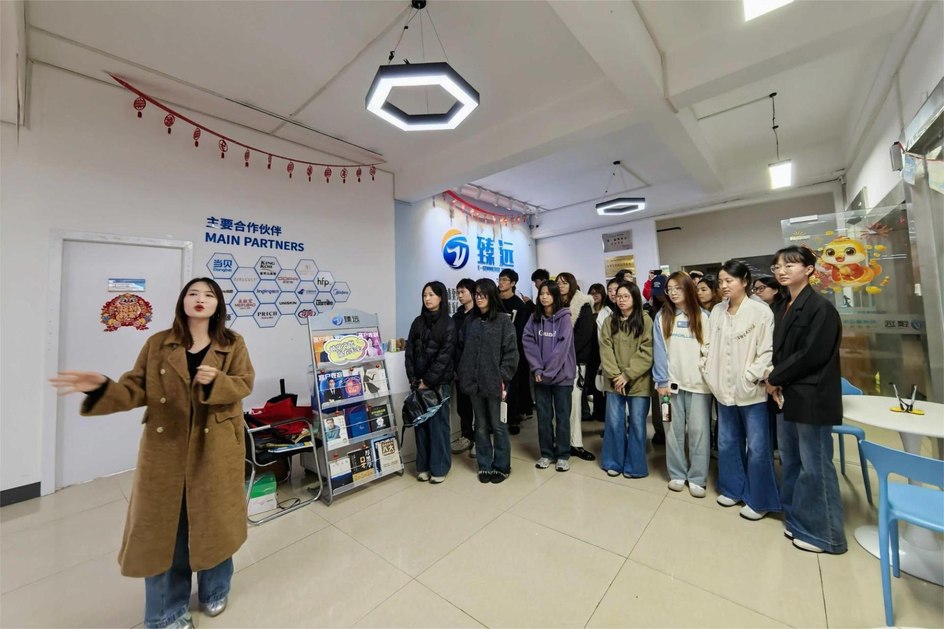 抵达企业后,在公司相关负责人的热情接待与全程陪同下,师生一行先后走进直播部门、客户服务部门、电商运营部门三大核心业务板块,沉浸式感受企业真实工作场景。在直播部门,学生们近距离观察主播选品、脚本设计、实时互动等全流程操作,负责人结合当下热门直播赛道案例,讲解直播话术设计、流量运营技巧及产品展示逻辑,让学生直观理解“内容 + 电商”的融合模式;在客户服务部门,工作人员演示了客户咨询响应、售后问题处理、客情关系维护的标准流程,强调 “以用户为中心” 的服务理念对提升客户复购率的关键作用;在电商运营部门,大家围绕店铺装修、商品上架优化、活动策划执行、数据分析复盘等实务内容展开交流,负责人用具体运营数据举例,生动解读了“从流量到转化”的核心运营逻辑。