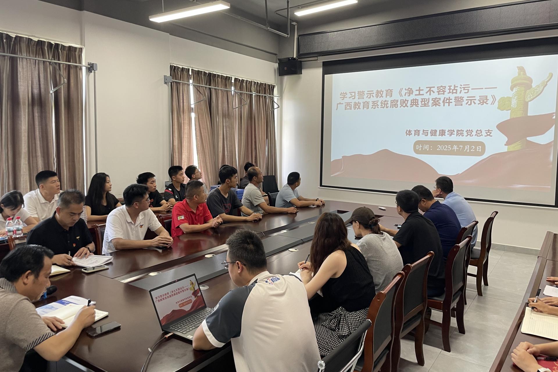 为深入开展深入贯彻中央八项规定精神学习教育,充分发挥典型案例的警示教育作用,7月2日,体育与健康学院党总支在行健楼205会议室开展典型案件警示教育,集中观看警示教育视频《领土不容玷污- 广西教育系统腐败典型案件警示录》,学院院长周勇、学院党总支书记关永康出席会议,本次会议由教工党支部书记刘卓主持。
