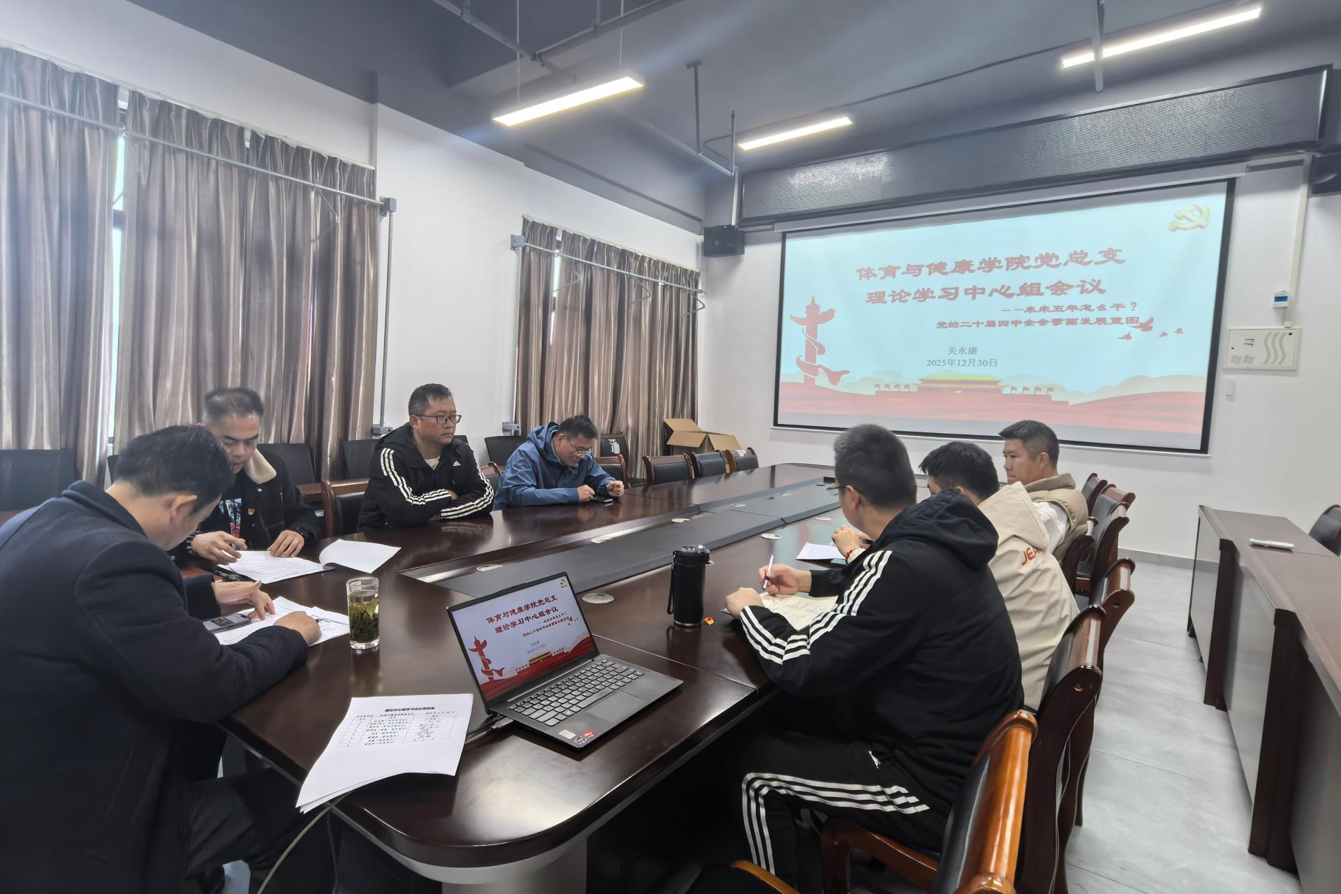 2025年12月30日,体育与健康学院党总支召开理论学习中心组专题学习会议,深入学习贯彻党的二十届四中全会精神,围绕“未来五年怎么干”主题展开研讨。会议强调以“六个坚持”为根本遵循,系统谋划未来五年发展路径,为全面建设社会主义现代化国家夯实基础。