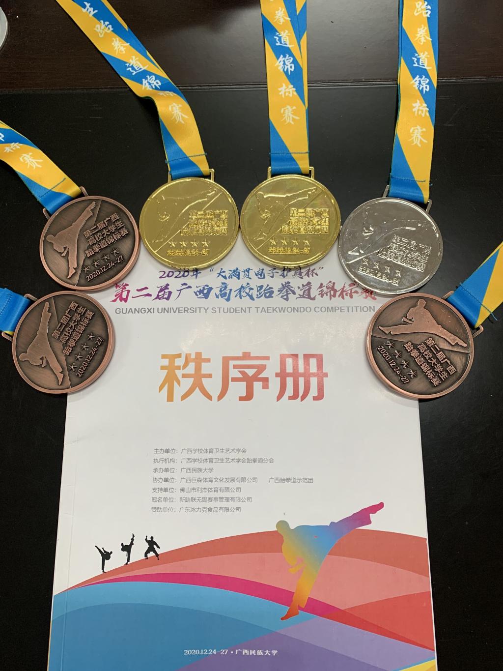 12月26日至27日,由广西学校体育卫生艺术学会主办,广西民族大学承办的2020年第二届广西高校跆拳道锦标赛在广西民族大学体育馆举行。我院由体育教研部钟依岑和薛伟佳老师任教练的跆拳道代表队参加本次赛事并斩获包含2项冠军在内的8个奖项。