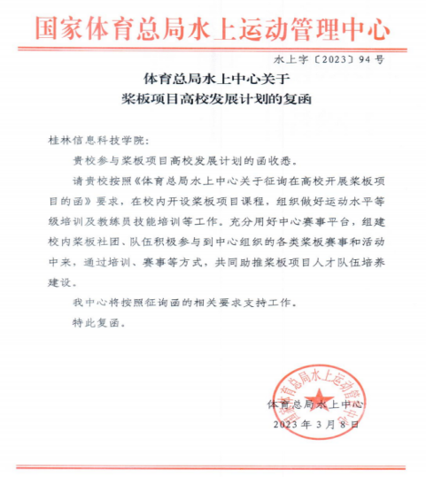 近日,国家体育总局水上运动管理中心复函〔水上字[2023]94号〕,批准pp电子体育与健康学院申报项目入选国家体育总局桨板项目高校发展计划。国家体育总局将在休闲体育项目-桨板运动的师资建设、课程设置和硬件设备等方面大力支持pp电子休闲体育专业建设。