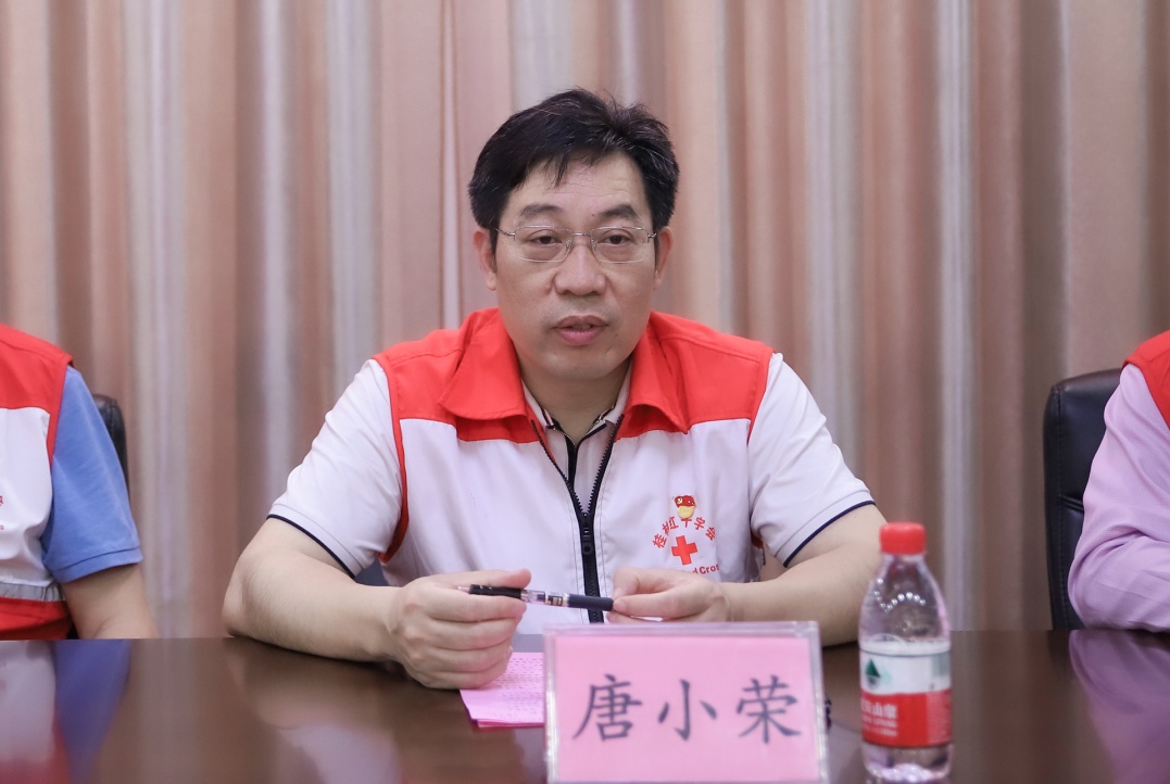 唐小荣会长就红十字会的发展历程和人道主义领域工作进行了简要的介绍,他表示,红十字会与高校有着广阔的合作共赢空间,特别是高校体育类专业师生在生命健康教育资源的需求上与红十字会相关平台和愿景高度契合。他倡议学校引导学生积极加入中国红十字会,成为光荣的红十字会会员,开展符合社会主义核心价值观的红十字运动基本知识宣传、救护知识普及、无偿献血宣传等方面的志愿服务工作,为打造桂林世界级旅游城市作出积极贡献。