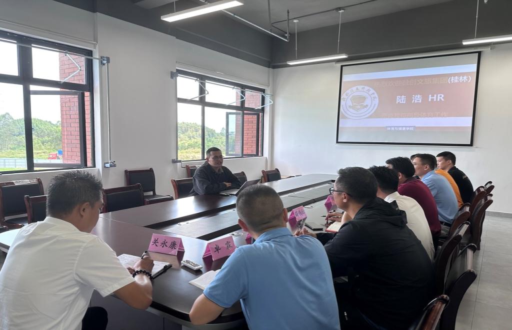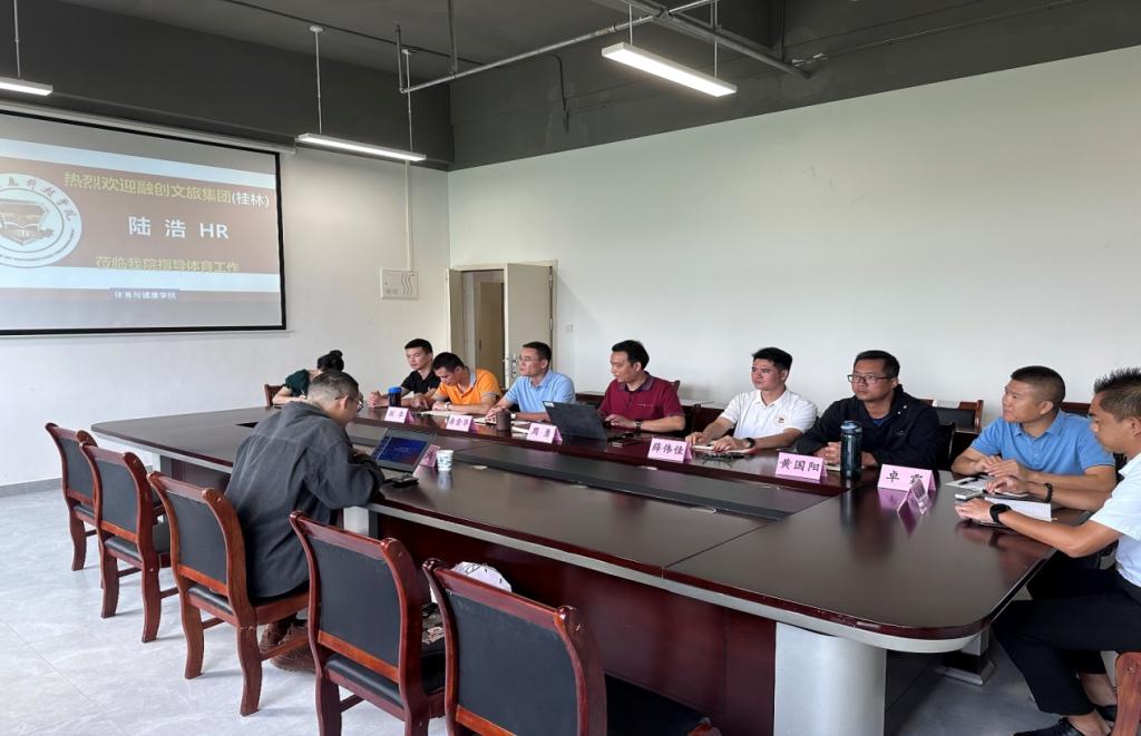9月22日上午,融创文旅集团(桂林)人事负责人陆浩到体育与健康学院开展校企合作调研,会议由体育与健康学院院长周勇主持,体育与健康学院各教研室主任在行健楼会议室参加了此次会议。