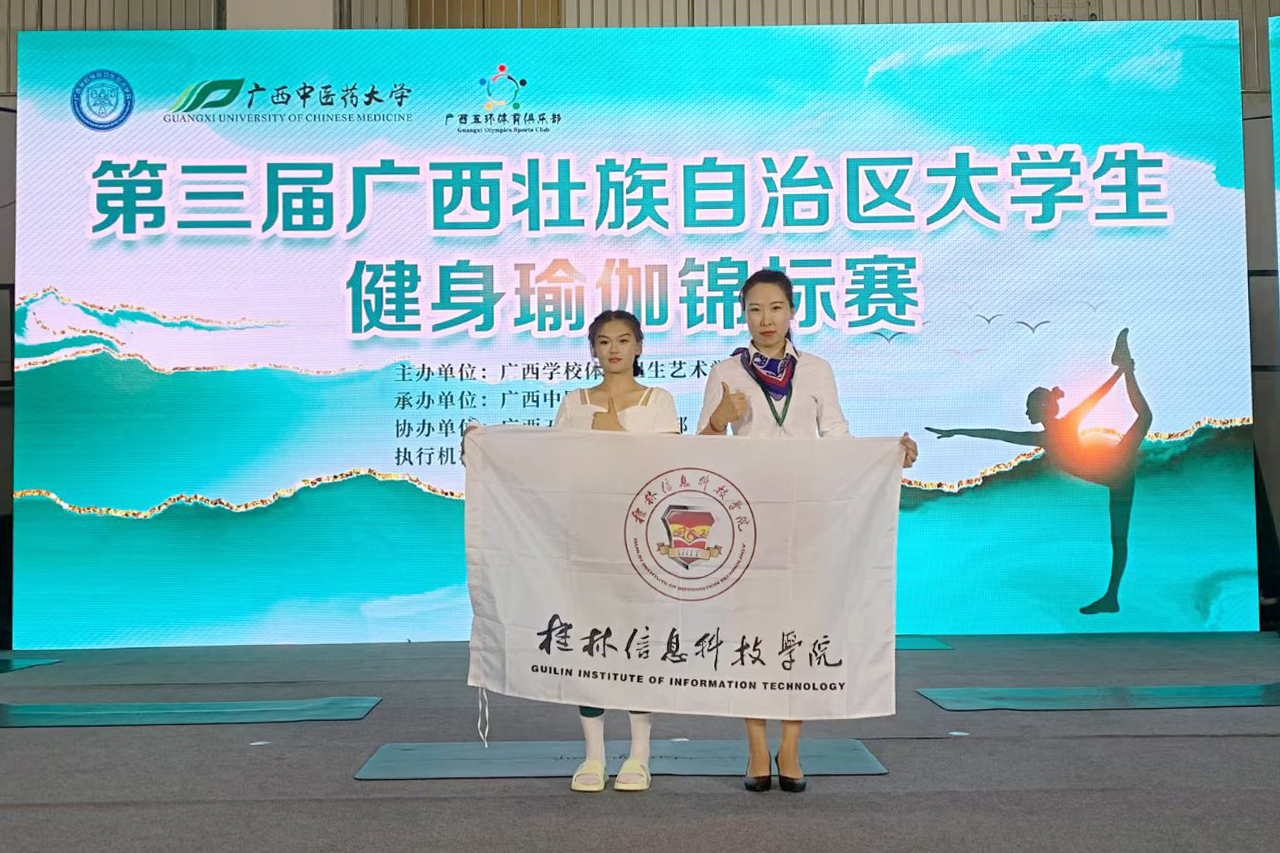 近日,由广西学校体育卫生艺术学会主办第三届广西壮族自治区大学生健身瑜伽锦标赛在广西中医药大学顺利举行。pp电子体育与健康学院王蕊、钟依岑两位老师带队参赛,周韦霜同学荣获体育专业组女子单人冠军。