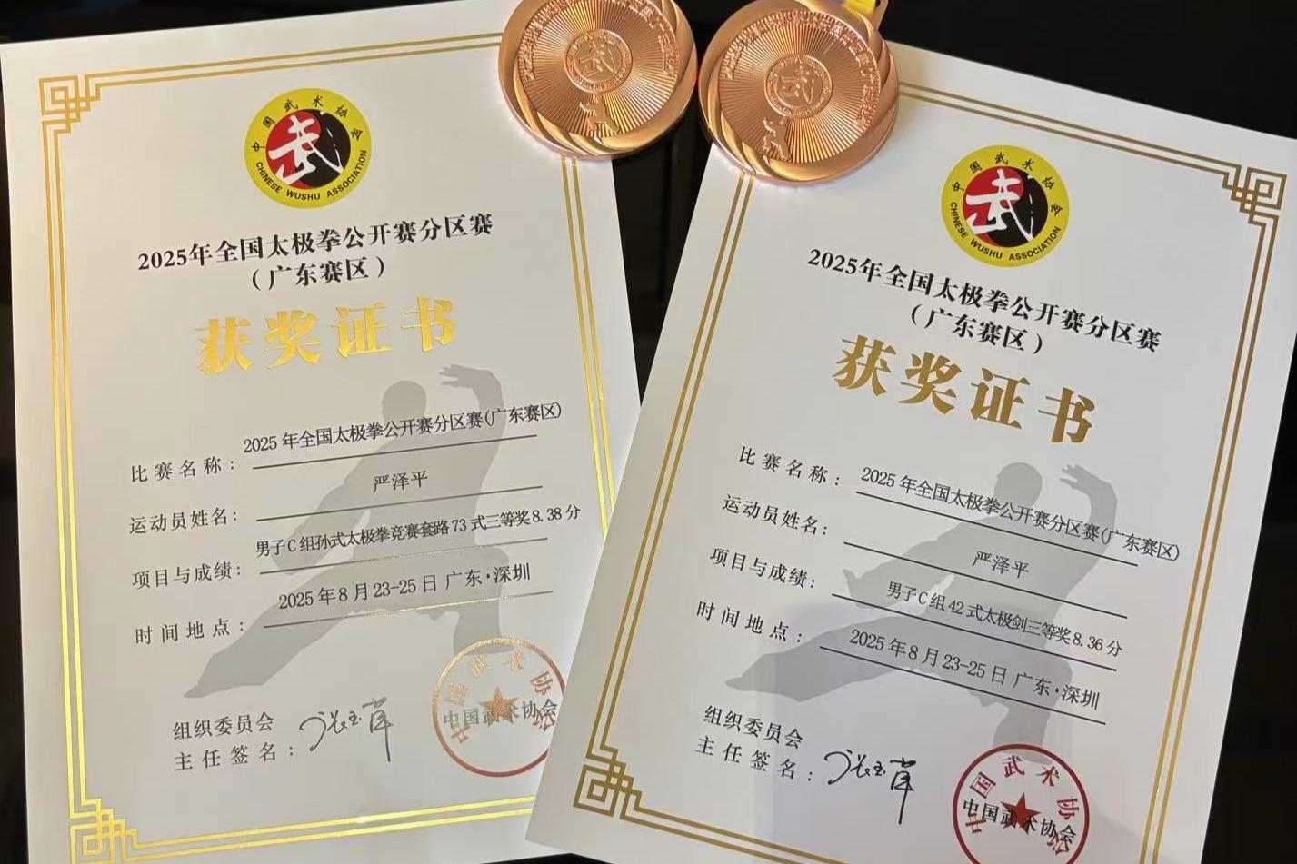 近日,2025年全国太极拳公开赛分区赛(广东赛区)暨广东省太极拳公开赛在深圳市光明区红花山体育中心成功举办。pp电子体育与健康学院教师严泽平在比赛中表现优异,荣获孙式太极拳三等奖和42式太极剑三等奖,展现了pp电子体育教师出色的专业素养与竞技水平。