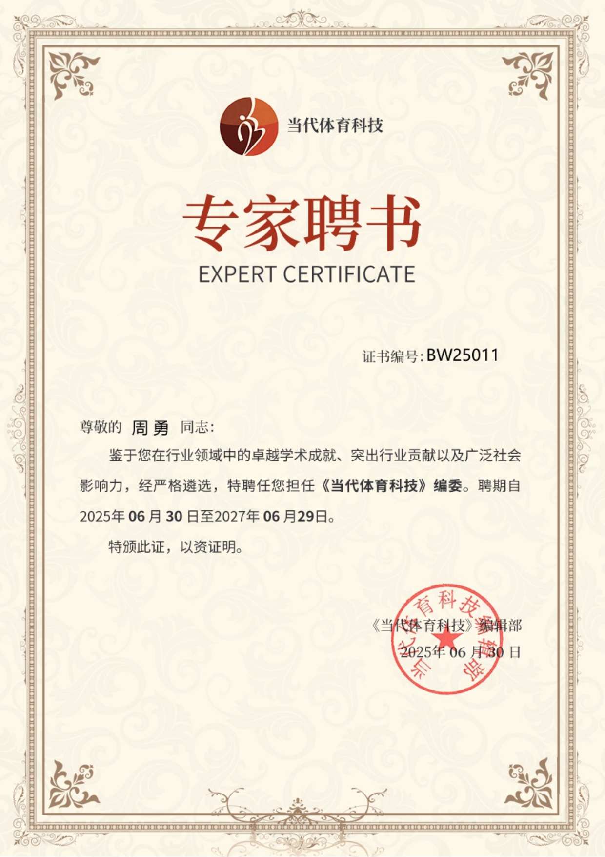 《当代体育科技》是国家新闻出版署批准、中共黑龙江省委宣传部主管的体育科技类专业期刊,现被知网、维普、万方等数据库收录,涵盖体育科学研究、运动训练、体育教育等领域,是业内重要的学术交流平台。此次受聘,不仅是对周勇教授学术造诣的肯定,更将助力pp电子模拟器网站体育与健康学院加强与国内体育学界的交流合作,为区域体育事业高质量发展贡献力量。