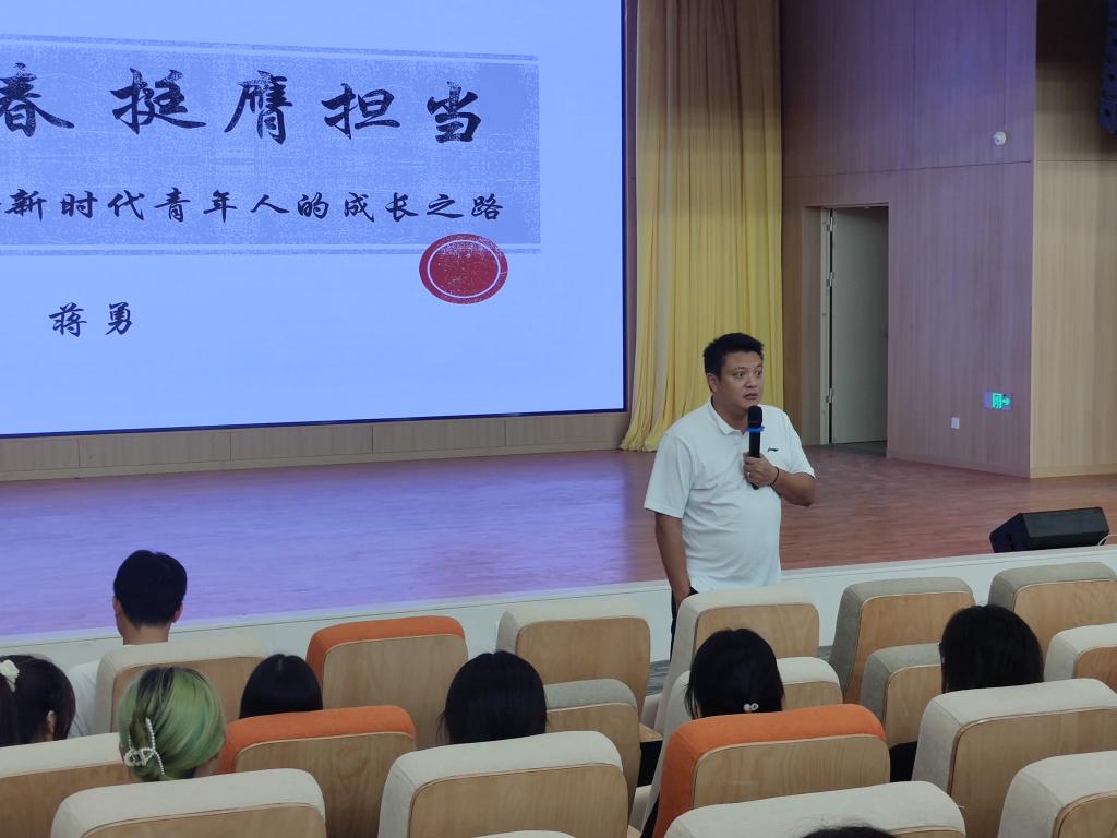 会上,蒋勇老师以“热血青春,挺膺担当——新时代青年人的成长之路”为题,勉励新同学要学会规划自己的人生,立志做有理想、敢担当、能吃苦、肯奋斗的新时代好青年,为强国建设、民族复兴挺膺担当,并引导新生秉持“奉献、友爱、互助、进步”的志愿服务精神,激励年轻人在追求梦想的道路上不断努力。