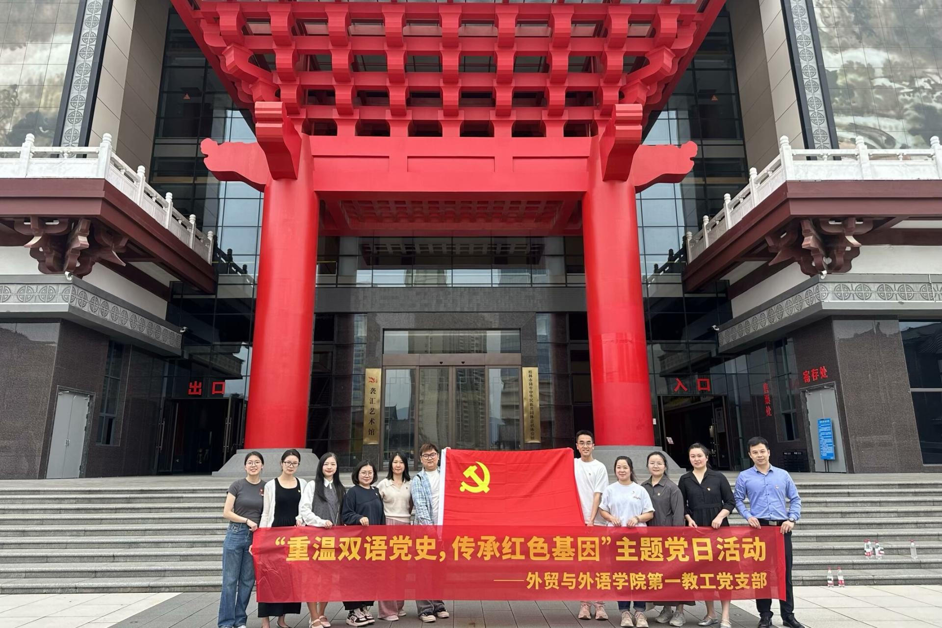 为扎实推进党史学习教育常态化、长效化,进一步加强党员思想政治建设与作风建设,2025年5月30日下午,外贸与外语学院第一教工党支部组织全体党员赴桂林袭汇艺术馆开展“重温双语党史,传承红色基因”主题党日活动,通过沉浸式学习感悟红色历史,汲取奋进力量。