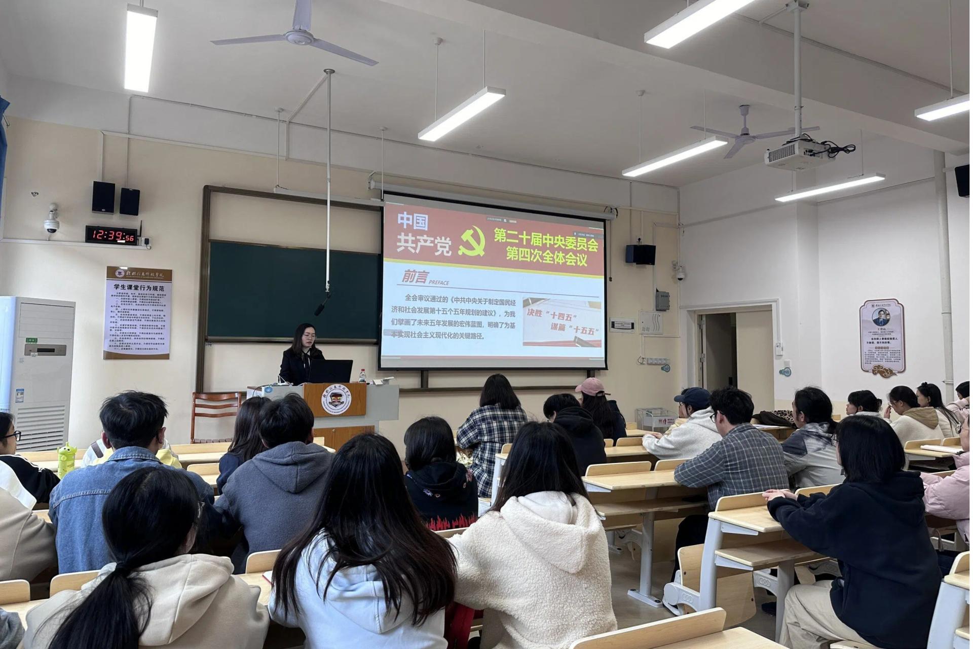 12月2日,外贸与外语学院第一学生党支部在D305开展以“党的二十届四中全会精神学习”为主题的学习会。本次学习特邀马克思主义学院党总支组织员陶纪宏老师主讲,围绕党的二十届四中全会内涵、习近平总书记重视“十五五”规划编制的深层原因等核心问题展开深入解读。