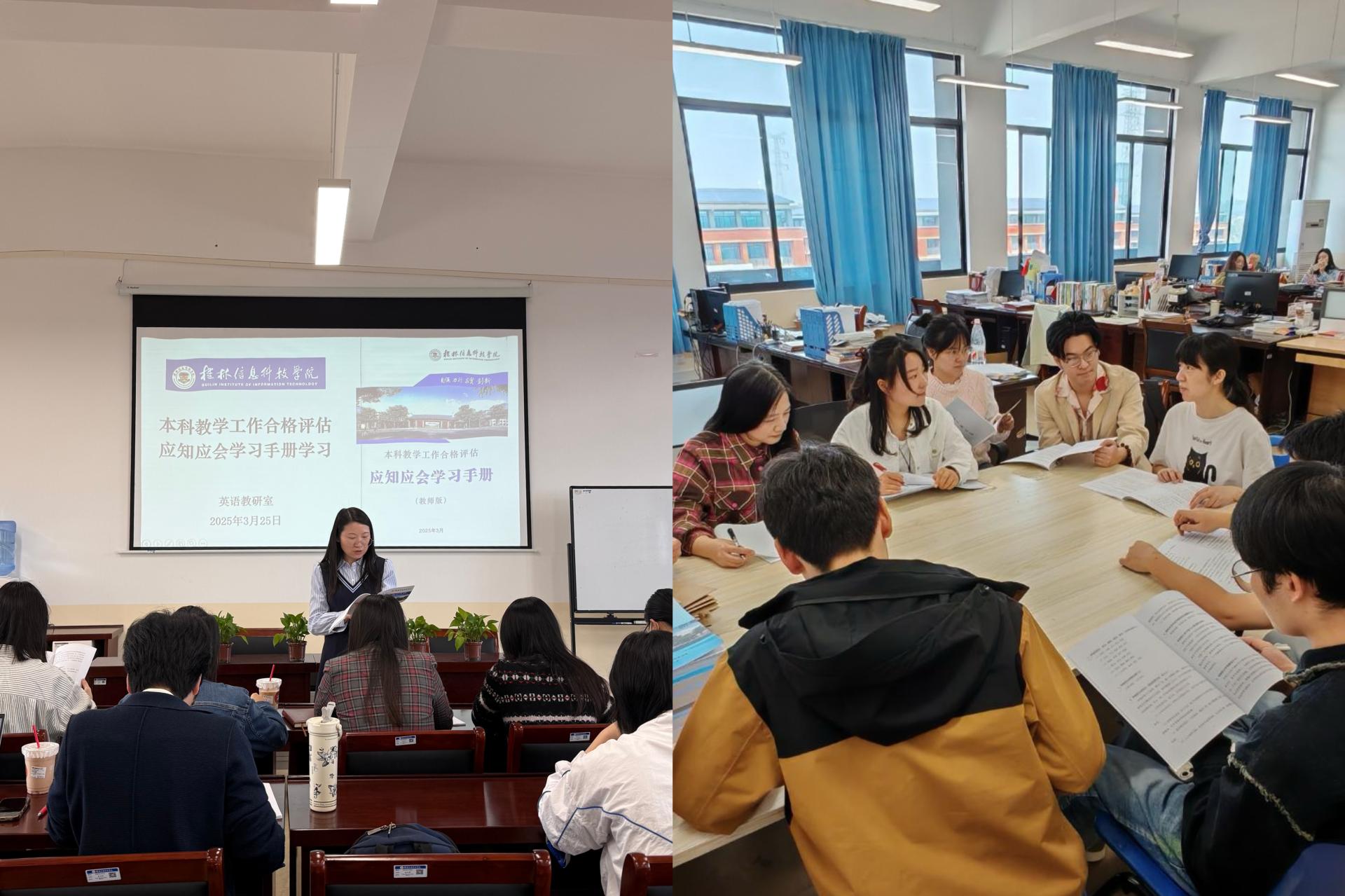 为全面提升学院教师对本科教学工作合格评估的认识,3月24日—25日,外贸与外语学院以各教研室为单位就《本科教学工作合格评估应知应会学习手册》开展专题学习。在各教研室主任的带领下对学习手册进行了系统讲解,内容涵盖学校基本概况、评估基础理论知识以及专家考查重点等多个关键方面。通过详尽的解读,教师们对学校的办学理念、评估指标体系以及迎评的具体要求有了更为清晰、准确的认知。教师们积极参与互动,结合本专业的特色与实际情况,对学习手册内容进行了更为细致的剖析和研讨。