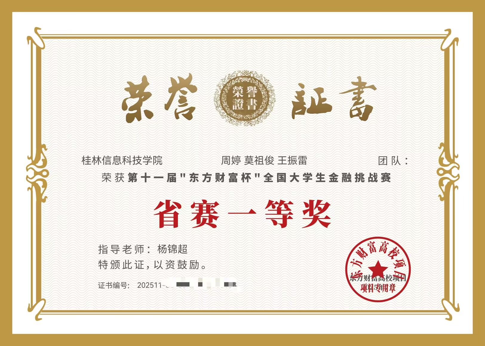 第十一届“东方财富杯”全国大学生金融挑战赛省赛一等奖获奖证书