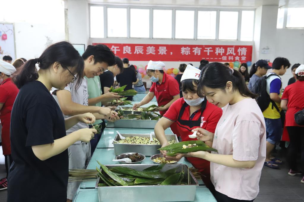 活动前工作人员将糯米、蜜枣、板栗、五花肉等材料准备好,通过微信平台报名的同学也纷纷赶来,不一会活动现场便都是同学们跃跃欲试的身影。活动中大家围在一起,在食堂阿姨的教学下纷纷使出看家本领,捋粽叶、做漏斗状、填糯米、压紧实、封口、扎捆,巧手翻飞,不一会儿功夫,三角形、牛角形、长条形等各式各样的漂亮粽子瞬间成型。期间,还有有奖竞答的环节,同学们热情高涨。活动后饮食中心还分别在两个食堂的窗口免费发放甜咸粽,让同学们一起分享品尝美味的粽子。