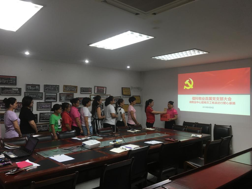 信科物业服务有限公司将“关心员工、重视员工、为员工解决工作与生活中的实际问题与困难”这一文化理论落实到实处,9月12日,信科物业党支部、信科物业公司组织全体党员及员工开展了爱心募捐活动。