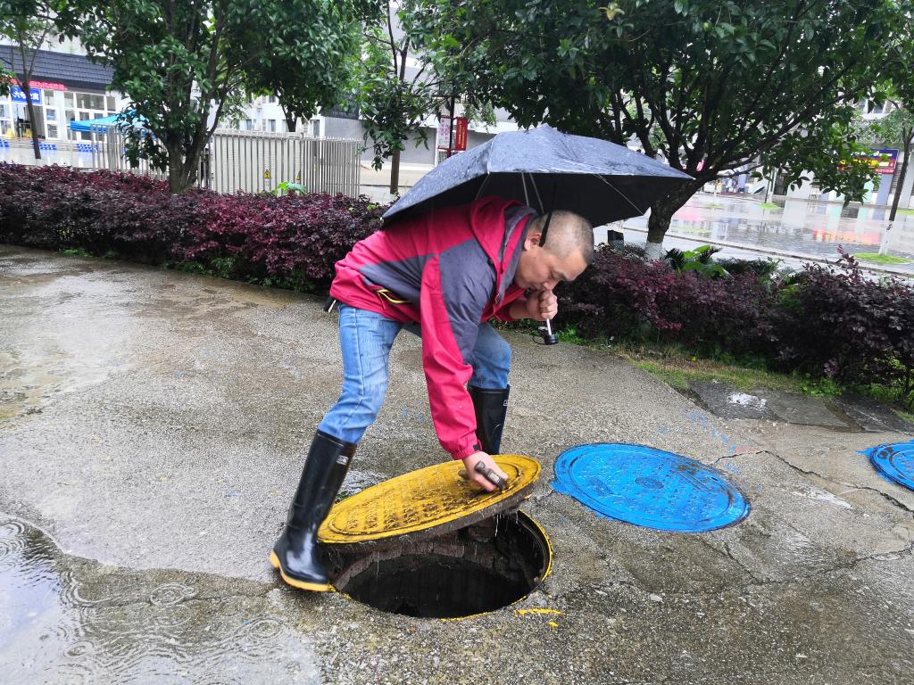 在冲沟清淤现场,维修员工不顾恶臭、雨淋,下到冲沟排水口,一丝不苟地将沟内淤泥、生活垃圾等清理干净,切实做好主汛期到来时校内排水顺畅工作,确保了校园安全稳定。