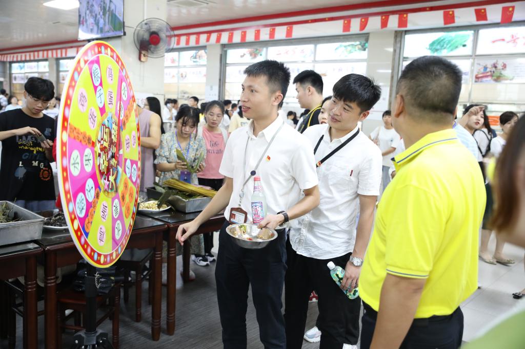 信科食堂将现代元素融入传统文化,通过寓教于乐的方式,搭建“服务育人”的活动平台,将活动分为“光盘有礼”、“传统投壶”、“体验包粽子”三个模块,师生凭就餐“光盘”或命中投壶,即可玩转幸运转盘一次,获得粽子、艾叶香囊、鸡蛋、鲜果等对应的礼品。汉服社团的同学们身着汉服为活动现场助兴,吸引不少师生驻足参与,活动现场热闹欢快。