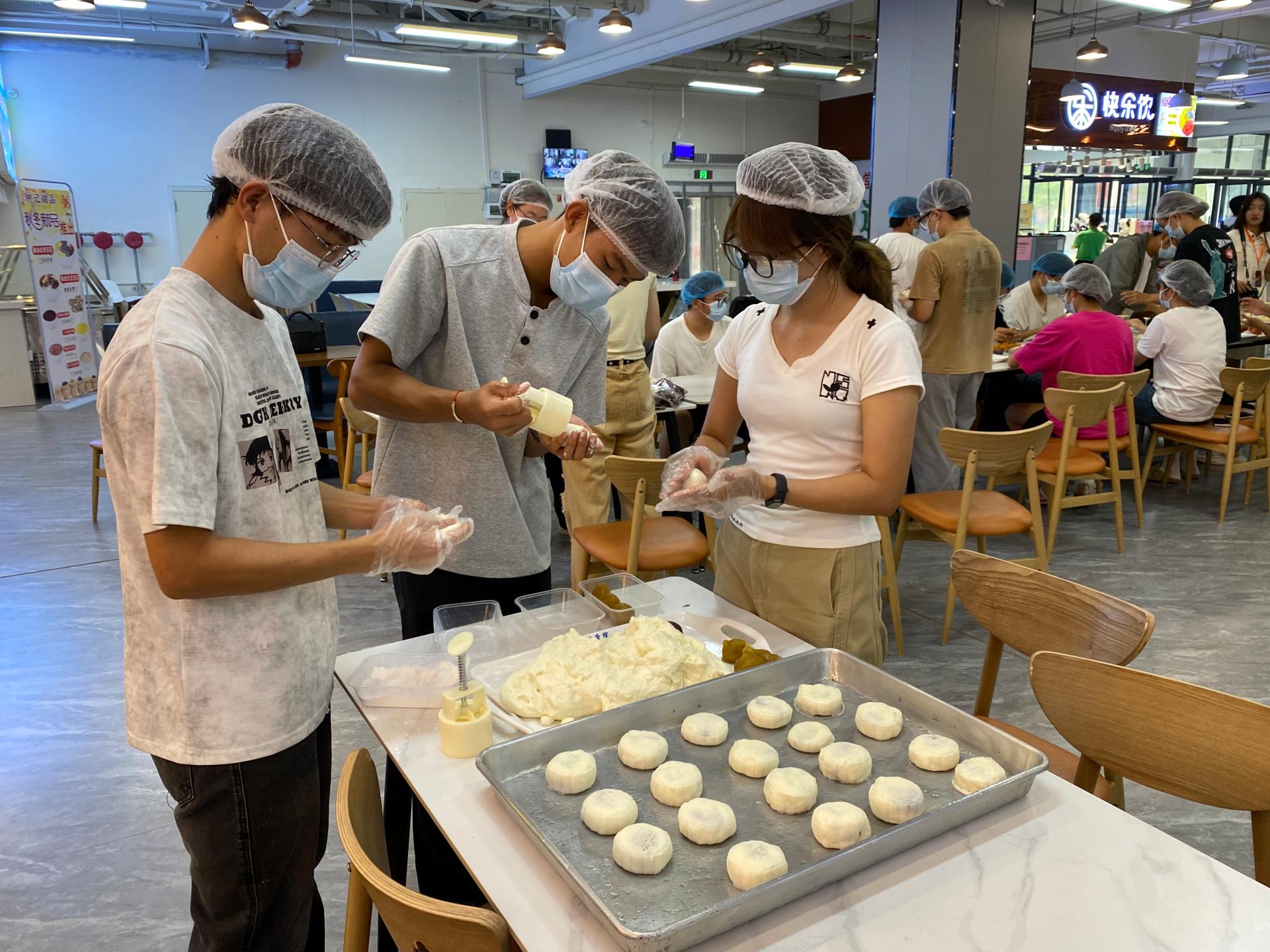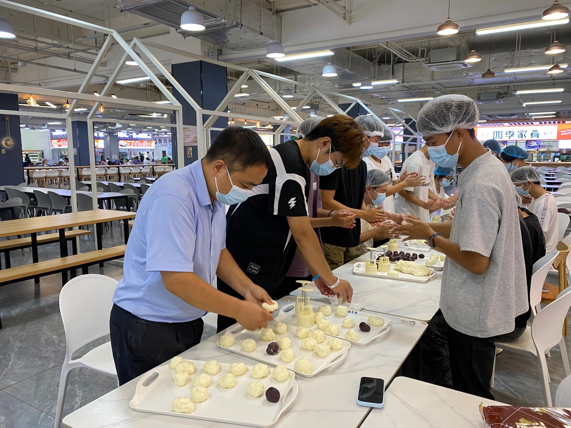 为了让同学们能亲切感受节日氛围,后勤服务处邀请学生一起参与手工制作月饼。从揉面团、包馅料,到压模成型、装饰花纹,每一步都有饮食中心的工作人员耐心指导。不管是烘焙新手,还是动手达人,都能在这里做出专属自己的中秋月饼。