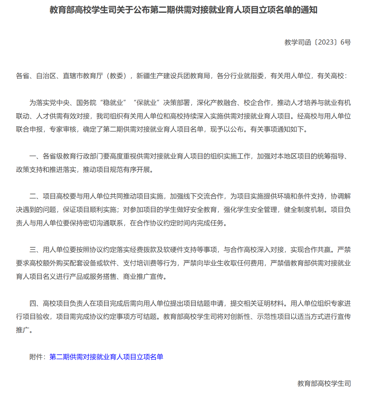 据了解,教育部供需对接就业育人项目是深化产教融合和校企合作,推动人才培养与就业联动的重要举措。项目分为四大类,分别为“定向人才培养培训项目”“就业实习基地项目”“人力资源提升项目”“重点领域校企合作项目”。项目申请需要经过校企对接、学校申请、用人单位申报、专家审核等程序。