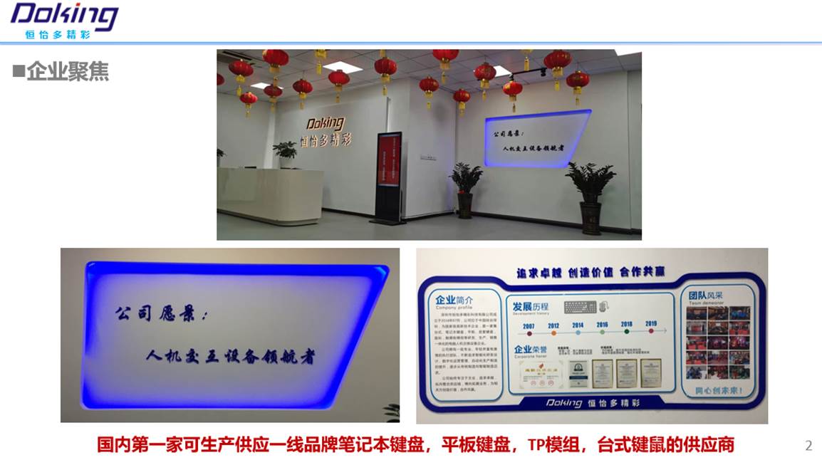 公司是一家集台式、笔记本键盘,平板、皮套键盘,鼠标,触摸板模组等研发、生产、销售一体化的电脑人机交换设备企业。