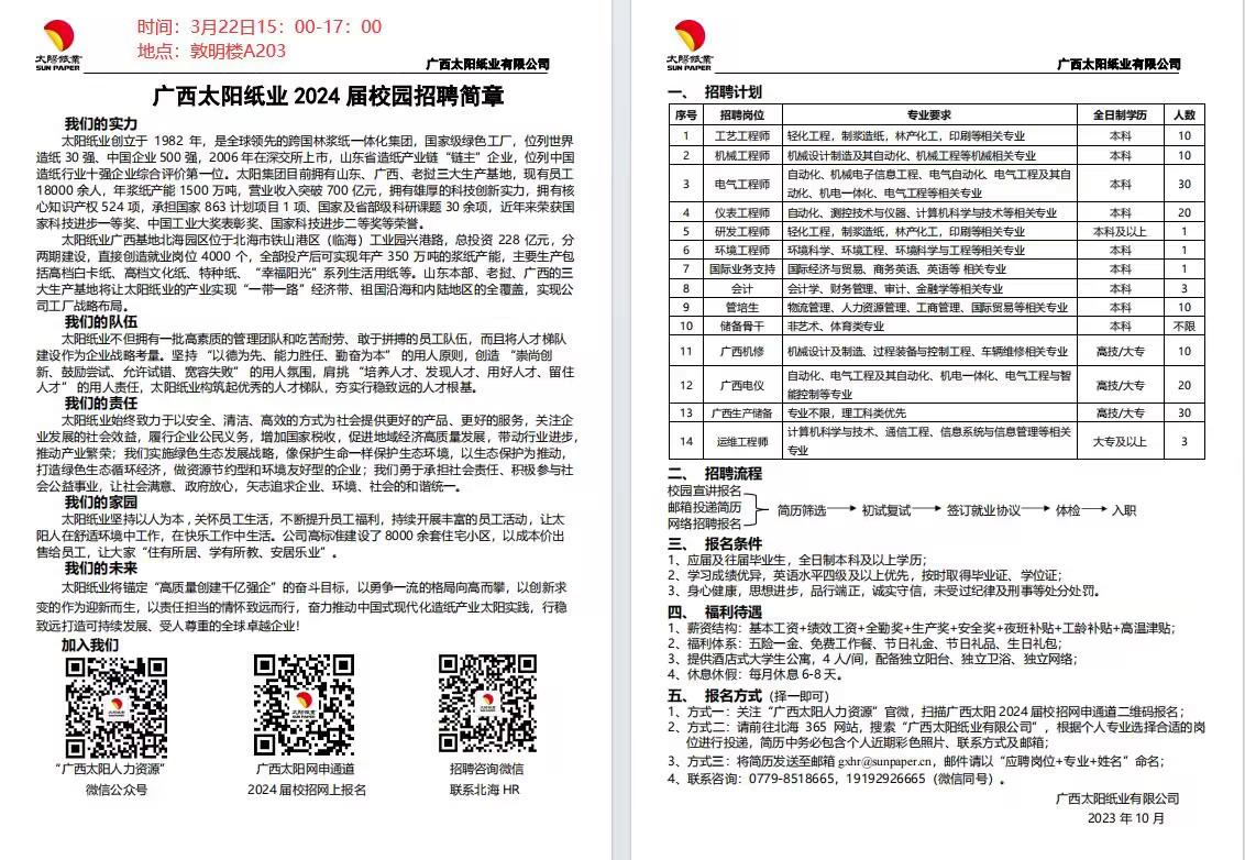 广西太阳纸业2024届校园招聘简章