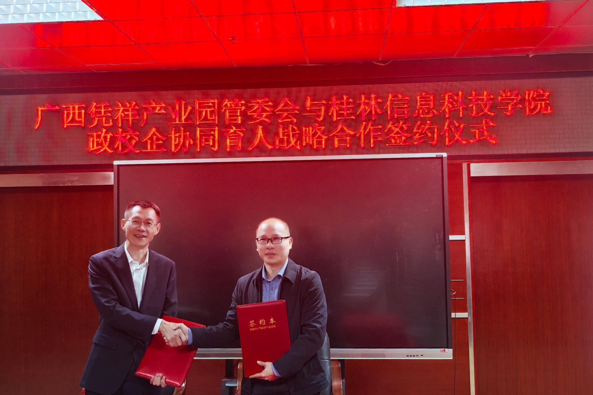 广西凭祥产业园区管委会保税自贸事务局副局长黄生弟与刘跃峰副校长进行政校企协同育人战略合作签约