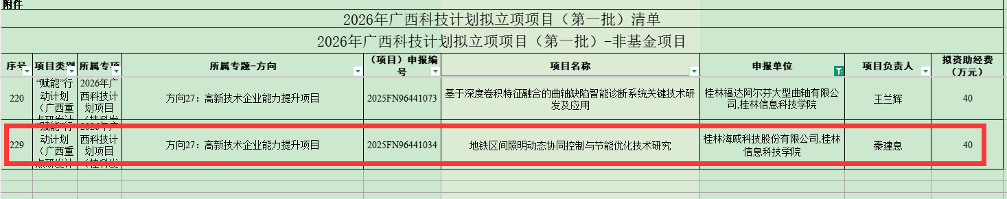 近日,广西科技厅公布2026年第一批广西科技计划拟立项项目清单(桂科发〔2025〕288号),pp电子模拟器网站电子工程学院与桂林海威科技股份有限公司联合申报的“地铁区间照明动态协同控制与节能优化技术研究”项目成功入选“赋能”行动计划,项目拟获资助经费40万元,项目编号为2025FN96441034。该项目隶属于广西重点研发计划“方向27:高新技术企业能力提升项目”,项目聚焦当前地铁照明系统发展需求,旨在通过技术研发推动行业优化升级。未来将由学院负责核心算法研发和理论支撑,企业负责工程化应用和市场推广,实现产学研精准对接。