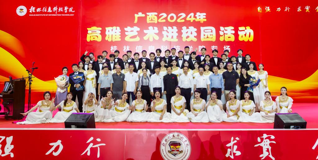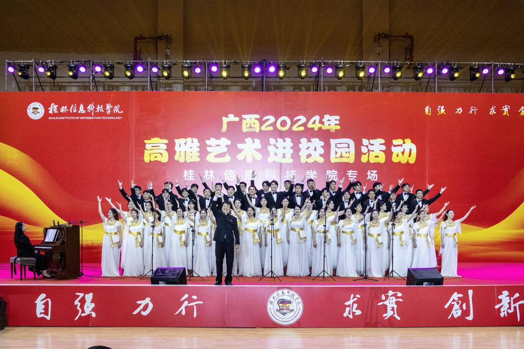 6月5日晚,广西2024年“高雅艺术进校园”活动在pp电子行健楼室内体育馆举办。“高雅艺术进校园”pp电子模拟器网站专场活动是由广西壮族自治区教育厅主办,广西艺术学院、pp电子模拟器网站承办,演出团队为广西艺术学院合唱团。学校董事长罗欣,校长解庆林,党委书记甘勇,董事、桂林信科物业服务有限公司董事长罗捷,副校长刘跃峰,党委副书记、纪委书记李飞,校长助理韩剑、彭鹏以及相关职能部门出席活动,各学院共1000余名师生代表共同聆听了此次音乐会。学校融媒体中心采取全媒体直播的方式在官方平台进行现场直播,据统计,线上收看量高达11万人次,点赞量达6万次,活动也赢得广大师生一致好评。