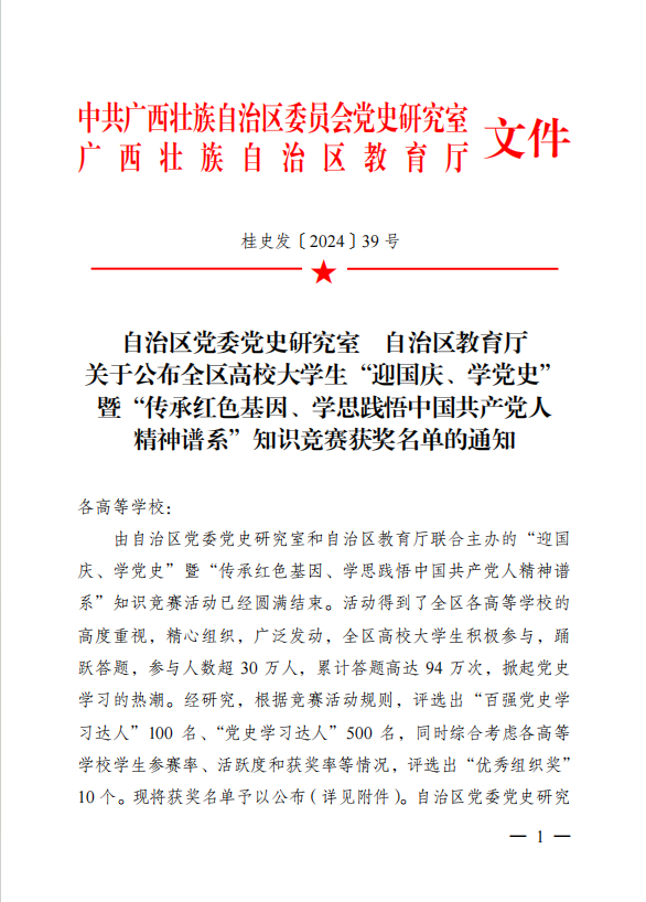 据悉,本次知识竞赛活动通过“桂教通”平台吸引了全区各高校30万余名学生参赛,累计答题高达94万次,主要考查同学们对中国共产党历史、中国共产党广西历史、中国共产党人精神谱系等相关知识的了解,掀起党史学习教育的热潮。根据竞赛活动规则,共评选出“百强党史学习教育达人”100 名、“党史学习达人”500 名。