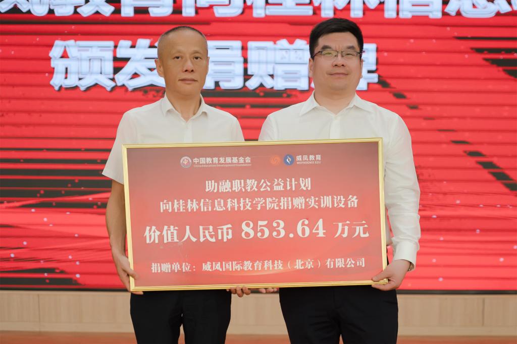 董事长罗欣向凤凰卫视威凤国际教育科技有限公司总经理郭功涛颁发捐赠证书及感谢牌