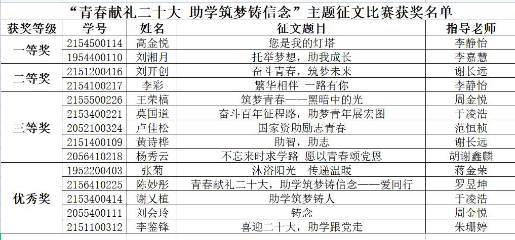 喜迎党的二十大,进一步推进学生资助政策宣传工作,pp电子组织学生开展“青春献礼二十大,助学筑梦铸信念”资助主题征文比赛。各学院学生积极参加,经学院选拔,共收到推荐作品50篇,经校内评审,共评选出一等奖作品2篇,二等奖作品2篇,三等奖作品5篇,优秀奖作品5篇。
