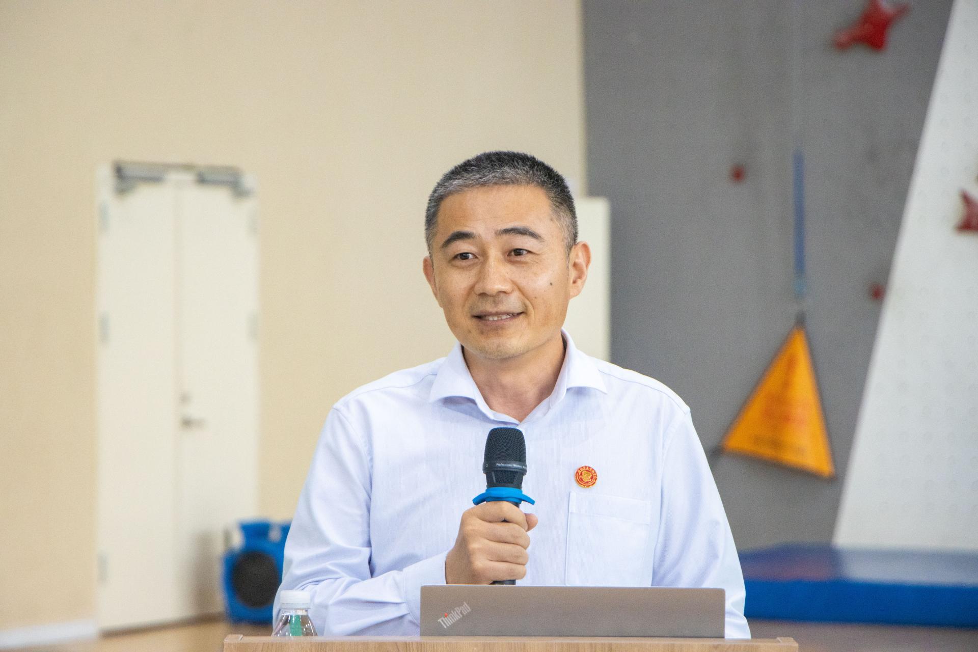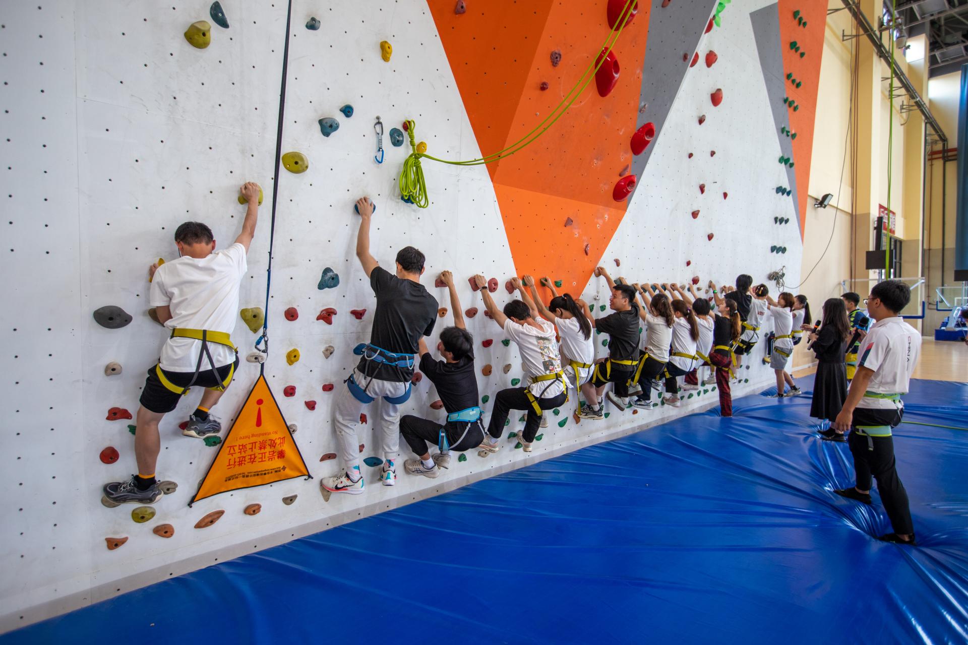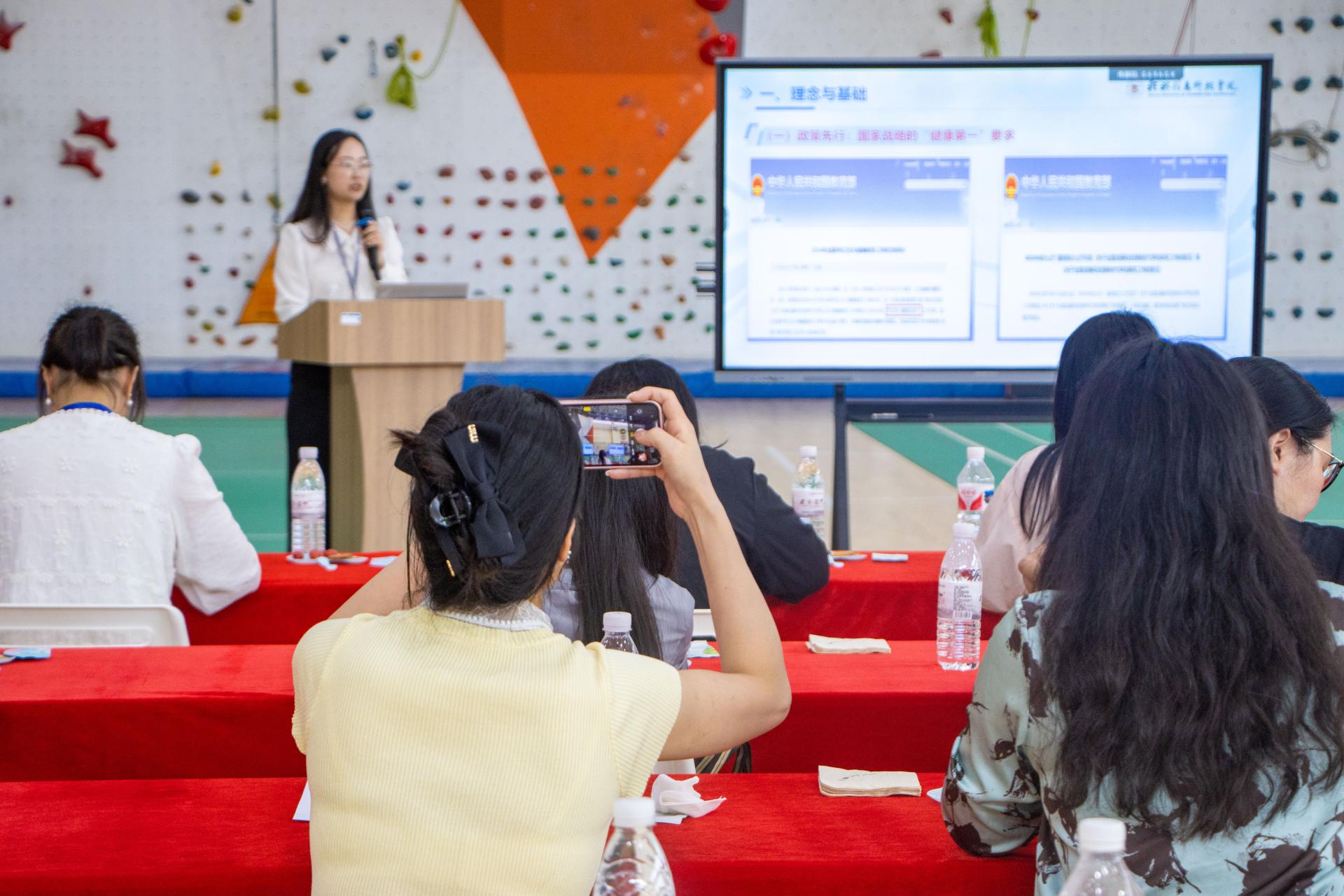 学校党委副书记李飞在致辞中,向莅临考察的全区高校心理中心负责人致以热烈欢迎。李书记简要回顾学校从独立学院转设及新校区建设发展历程,强调“以终为始、以生为本”的办学理念与育人环境建设。重点介绍学校历年来的心理健康教育成果,提出希望各高校深化合作,携手推进心理育人工作高质量发展的期望。随后,心理中心围绕学校学生综合素质训练基地建设,汇报心理健康与体育融合的创新思路。紧接着心理教师与体育教师共同开展的20分钟攀岩示范课,生动呈现“心体共育”实践成效,直观展示学生在挑战中提升心理韧性的过程,为汇报内容提供鲜活例证。