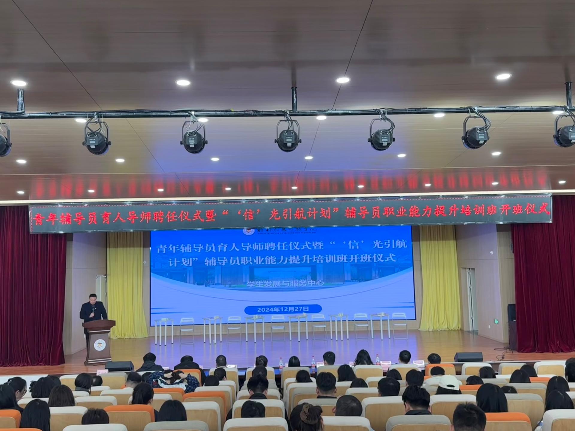 为进一步促进学校辅导员队伍的教育管理水平,提高辅导员的综合素质和业务能力,12月27日下午,学生发展与服务中心在博文楼F107报告厅召开青年辅导员育人导师聘任仪式暨“‘信’光引航计划”辅导员职业能力提升培训班开班仪式。学校副校长李桂华,纪委书记、校长助理周璇出席,各二级学院党委(党总支)书记、学工办主任以及全体辅导员共130余人参加。本次活动仪式由学生发展与服务中心蒋勇老师主持。