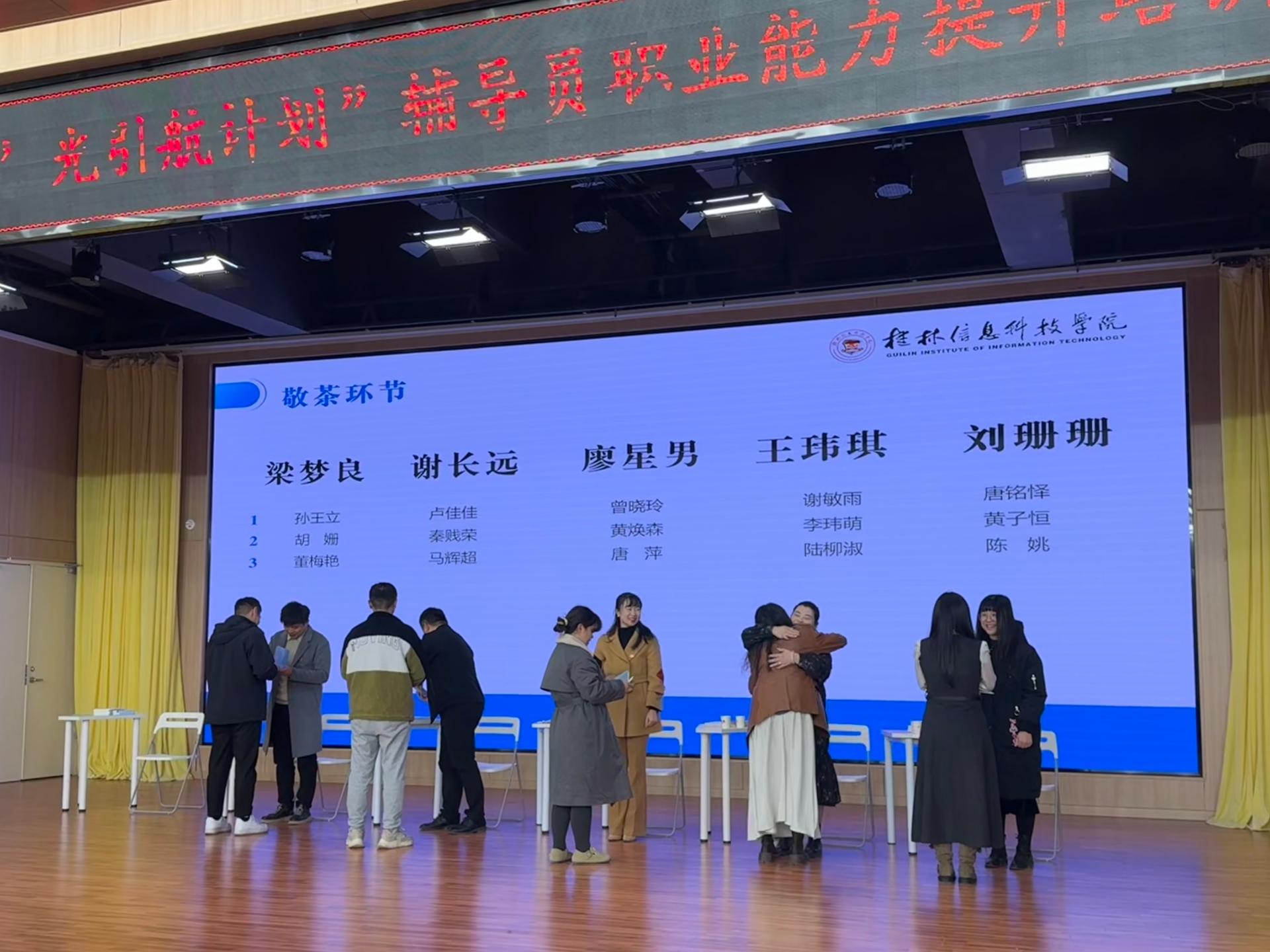 在敬茶赠礼环节,71名青年辅导员纷纷上台为导师敬上一杯香茗,以茶敬师,表达对导师深深的敬意与谢意。导师们以一本笔记本、一支钢笔作为回赠,蕴含着对徒弟们的热情期盼与殷切祝福。