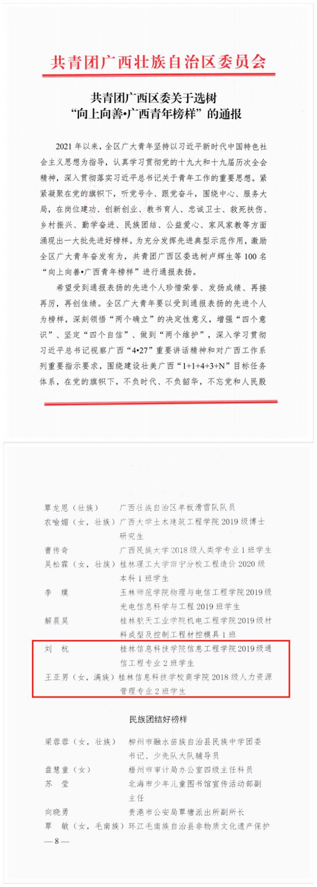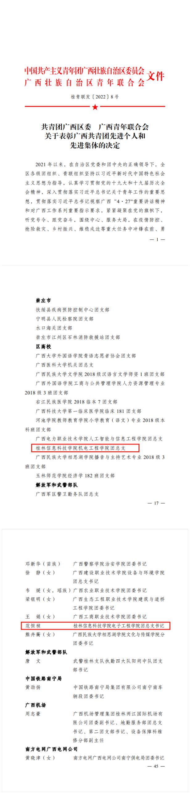 2022年是中国共青团成立100周年。近日,共青团广西区委、共青团桂林市委相继印发了《共青团广西区委 广西青年联合会关于表彰广西共青团先进个人和先进集体的决定》、《共青团广西区委办公室关于选树“向上向善•广西青年榜样”工作的通知》、《关于表扬2021年度“桂林市优秀共青团员”“桂林市优秀共青团干部”“桂林市五四红旗团委”和“桂林市五四红旗团支部(总支)”的决定》,pp电子共计4个集体、13名个人光荣上榜,获奖项目丰硕、获奖数量再创新高。