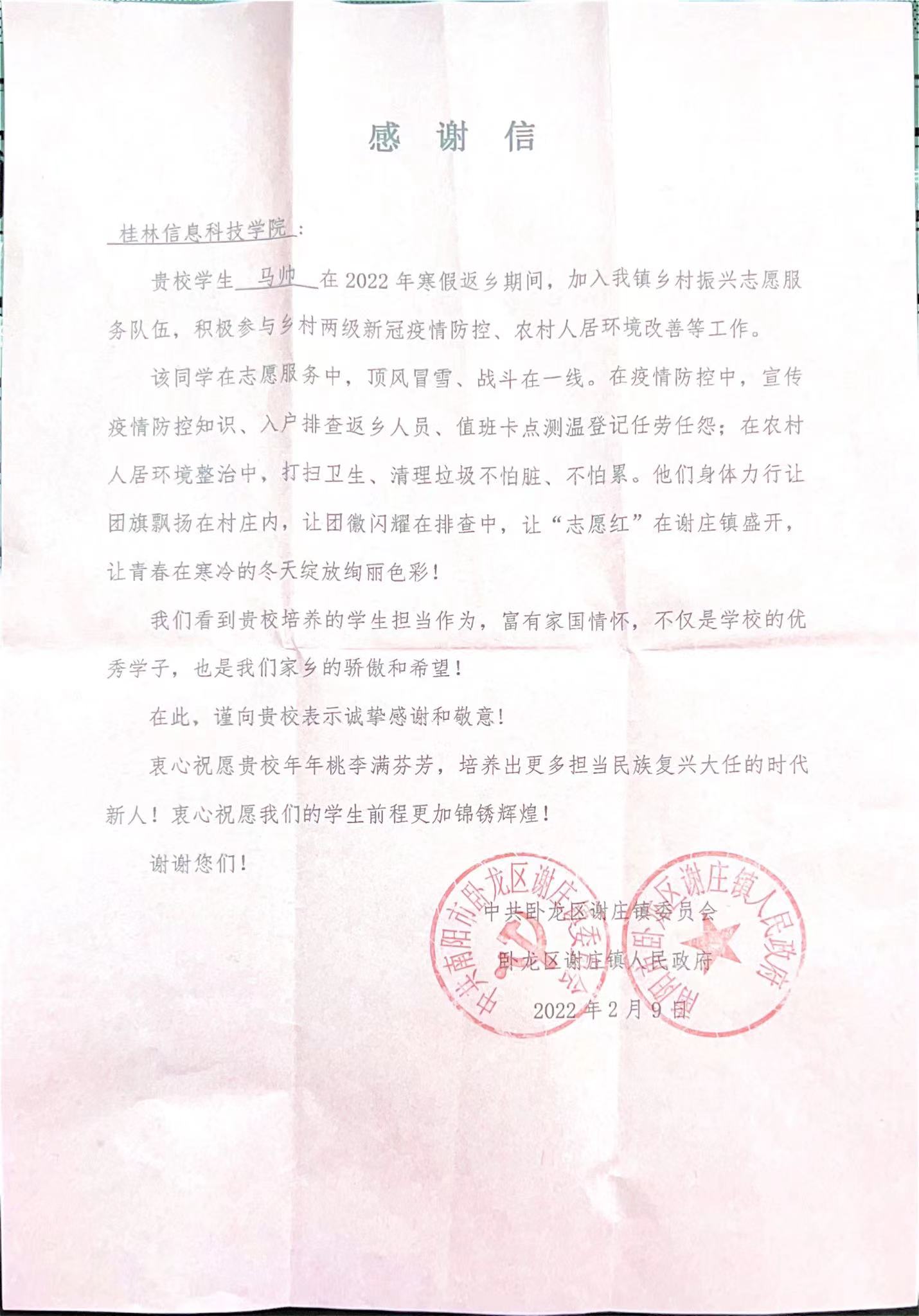 感谢信指出,马帅同学在志愿服务中顶风冒雪、战斗在一线;在疫情防控中任劳任怨;在农村人居环境整治中不怕脏、不怕累,充分发挥志愿者精神,不辞劳苦,以饱满的热情顺利完成志愿服务工作,得到中共卧龙区谢庄镇委员会、卧龙区谢庄镇人民政府的高度认可与赞扬。同时对pp电子培养出如此乐于奉献的青年志愿者表示感谢,也借此希望广大同学继续学习和发扬“志愿者精神”。
