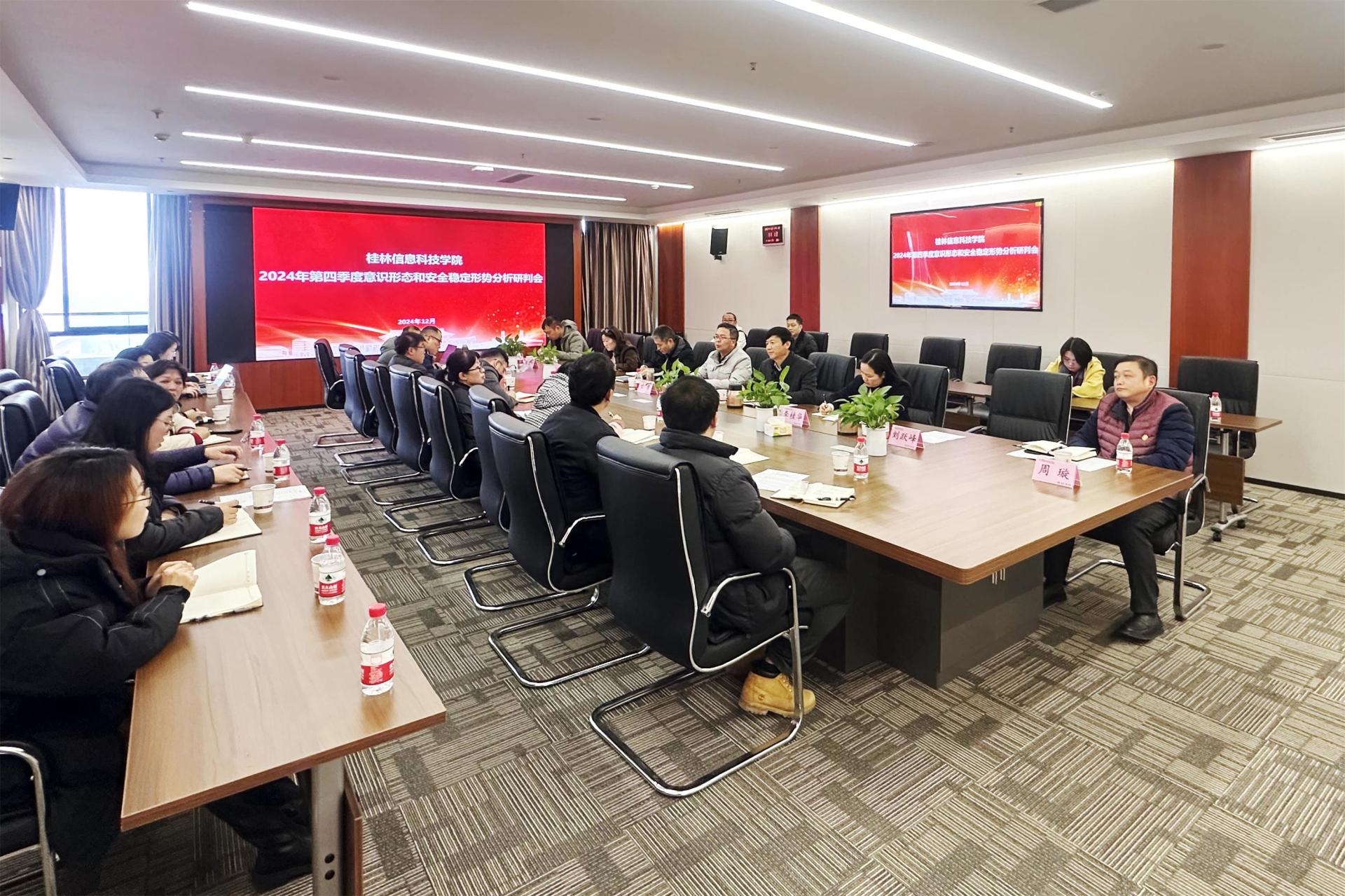 学校召开2024年第四季度意识形态和安全稳定形势分析研判会12月17日上午,学校在知行楼810会议室召开2024年第四季度意识形态与校园安全稳定形势分析研判会,学校意识形态工作领导小组全体成员参加会议。会议由党委书记甘勇主持。甘勇指出,在推进学校高质量发展的进程中,...