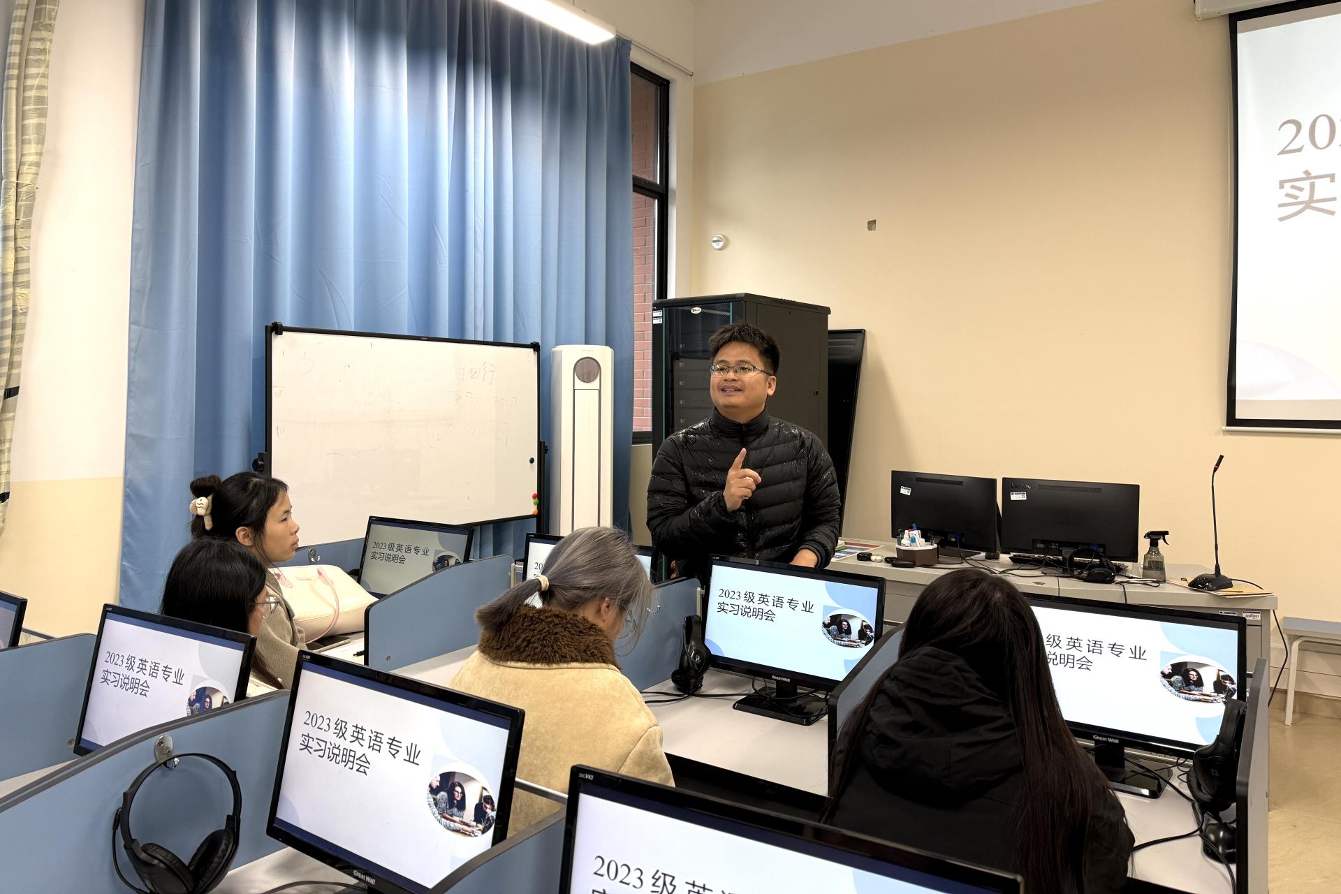 外贸与外语学院召开2023级英语专业学生实习说明会2025年12月23日,外贸与外语学院在F103教室召开2023级英语专业学生实习说明会。会议由英语专业教研室副主任谢彩华老师主持,学院副院长赖安老师、英语专业教研室主任王雪利老师、2023级辅导员罗吉凤老师及相关实...